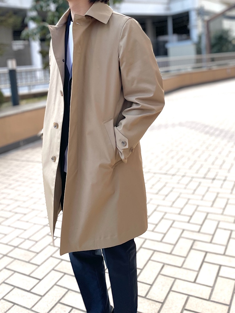 ドレスのコートにややカジュアルめのセットアップを合わせたビジネスカジュアルのコーディネートです。