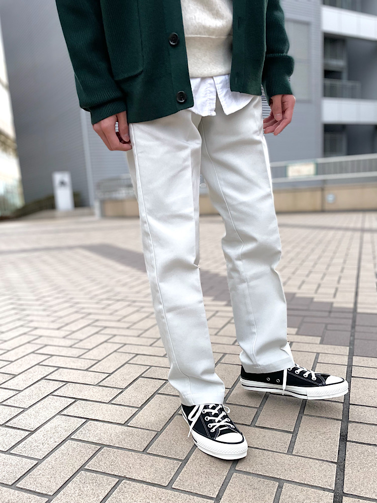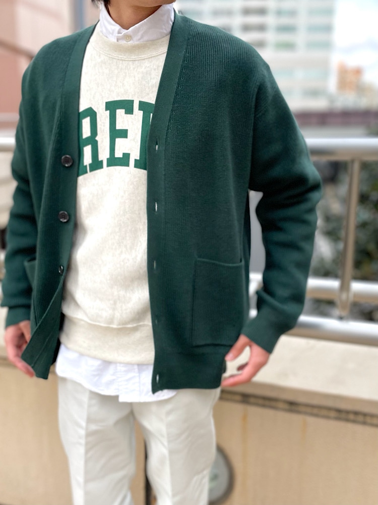 ゆったりしたカーディガンに別注ディッキーズを合わせた大人のリラックススタイルです。