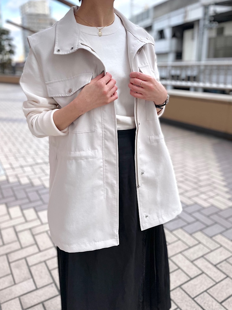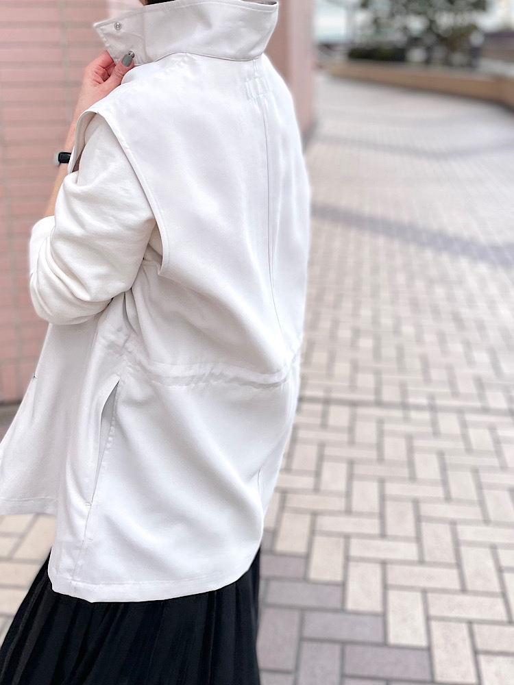 サイズ感 : 全体的にゆとりあり。少し厚手のものにも楽に羽織れます。ウエストが絞れるので合わせるアイテムによって身幅を合わせて着ていただけます。