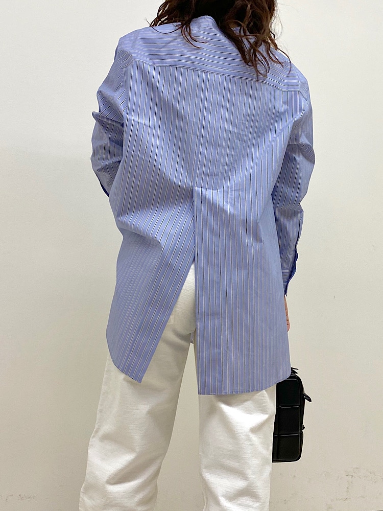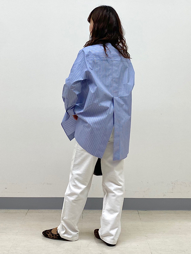 着心地:一見ベーシックなノーカラーシャツだが、背中側に腰位置程度までの深さのスリットが入っており、ポイントになる。