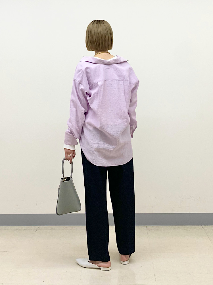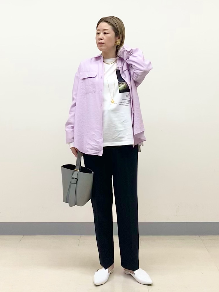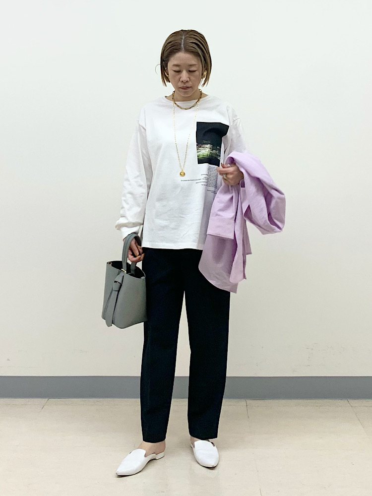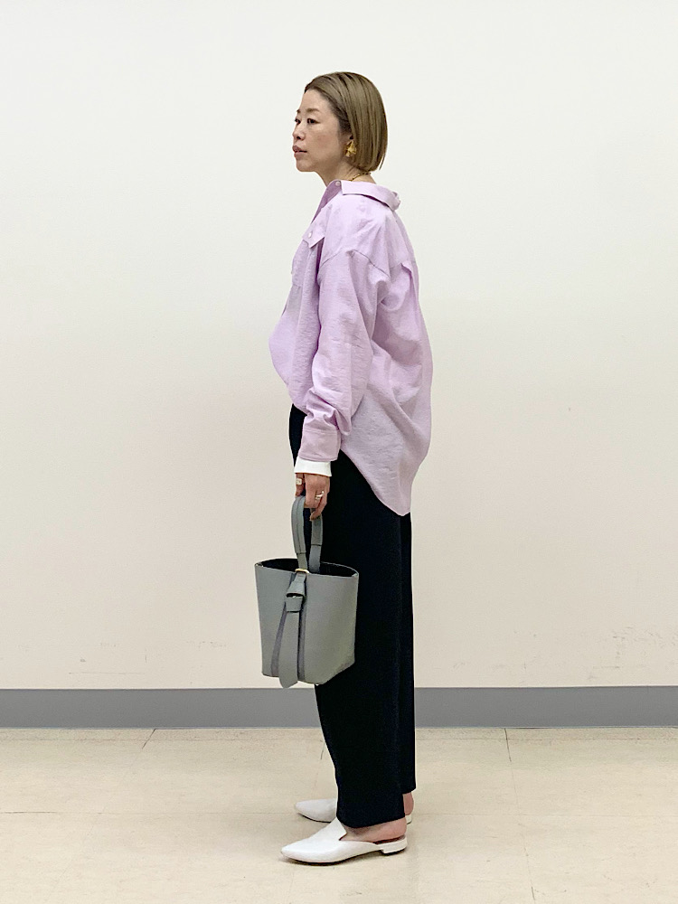 ボトムスは濃い色を合わせ、きれいめにコーディネート。