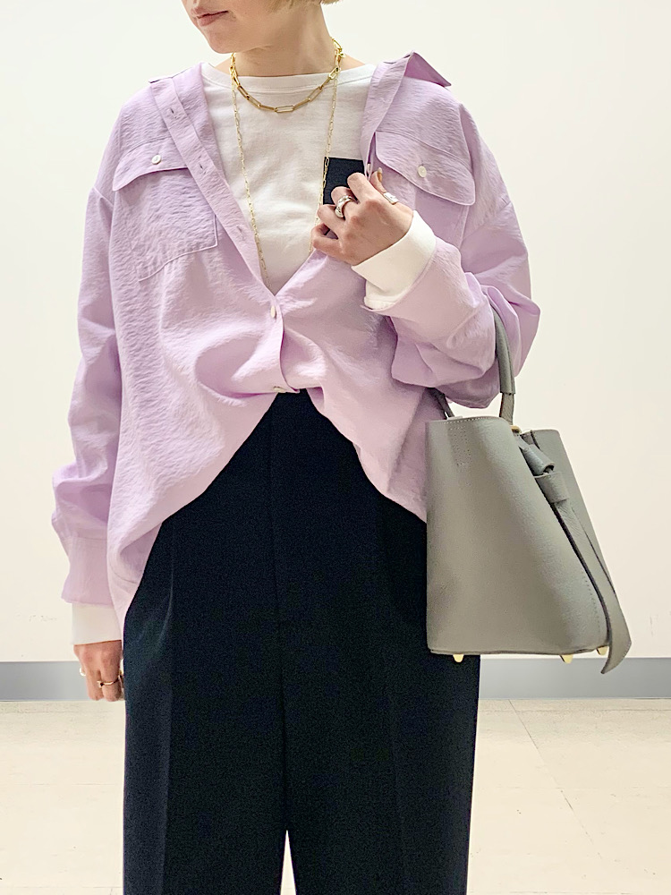 カラーシャツにTシャツをレイヤードし、カジュアルダウン。