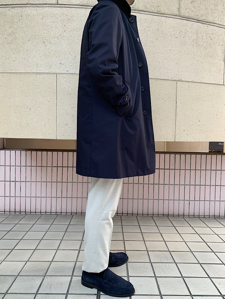 サイズ感:細身だがジャケットの上から羽織る余裕はある。