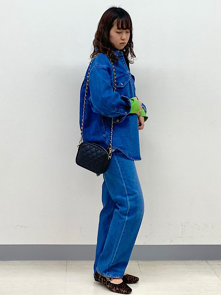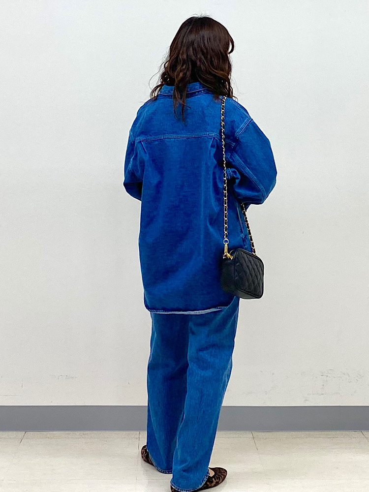 今期たくさんご用意のあるデニムアイテムを使ってセットアップ風に。インナーの明るいグリーンと上品なチェーンのバッグがポイントです。