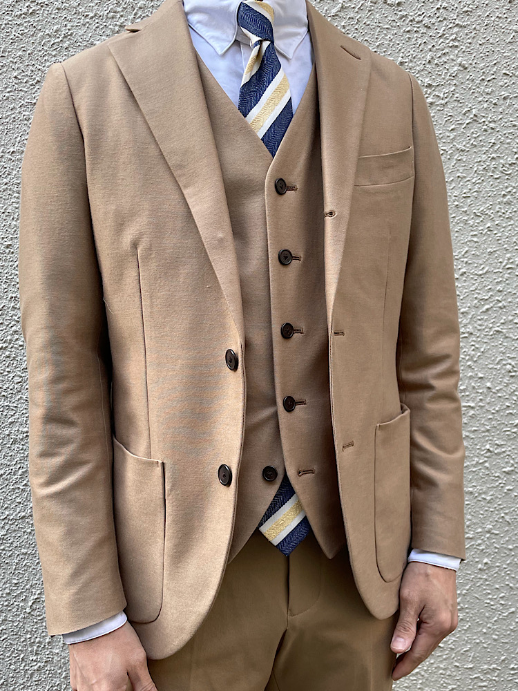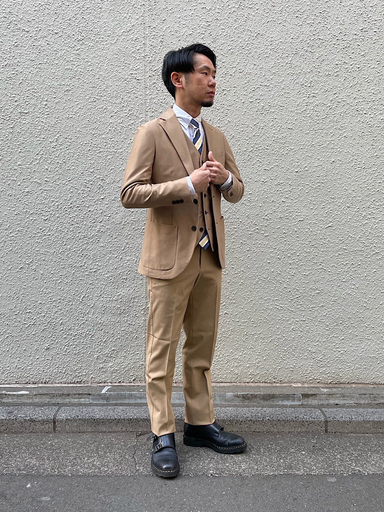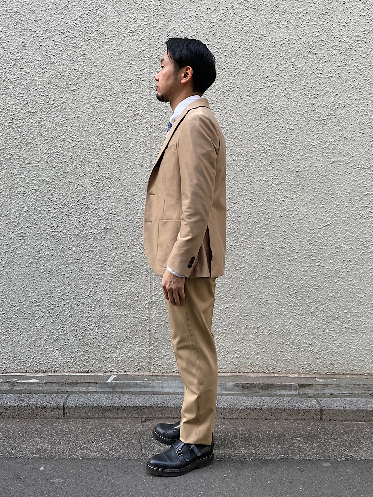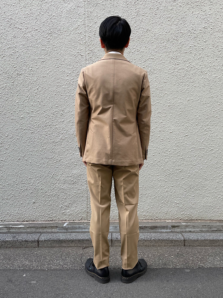 素材感/着心地:コットン、ポリエステル、ポリウレタンの合繊素材。肌あたり良く、伸縮性があり、穿きやすいです。トップスとは生地は違いですが、色のトーンを合わせてセットアップ風にコーディネートしたジャケパンスタイル。