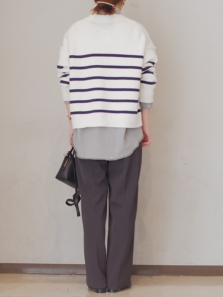 着心地:センタープレスが入っているのでシルエットが綺麗に見えますし、後ろゴムになっているのでストレスフリーに着ていただけます。