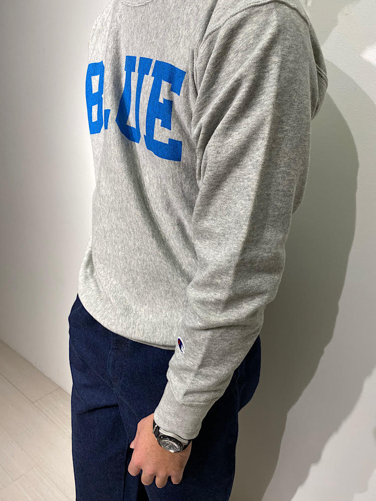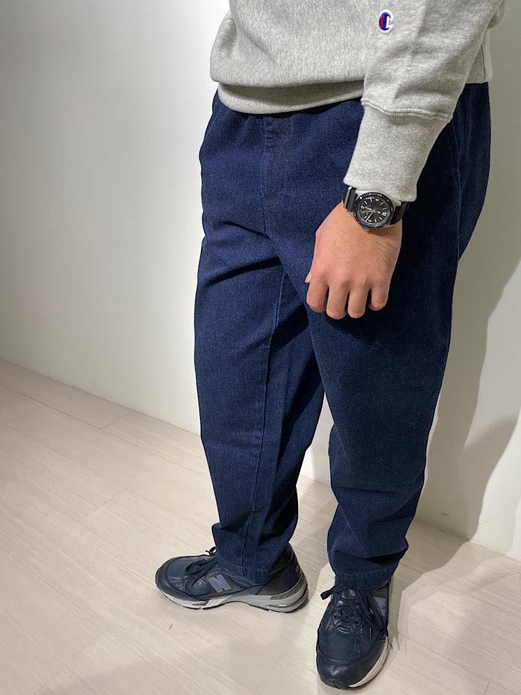 チャンピオンのスウェットとデニムのイージーパンツを使ったカジュアルコーデです。