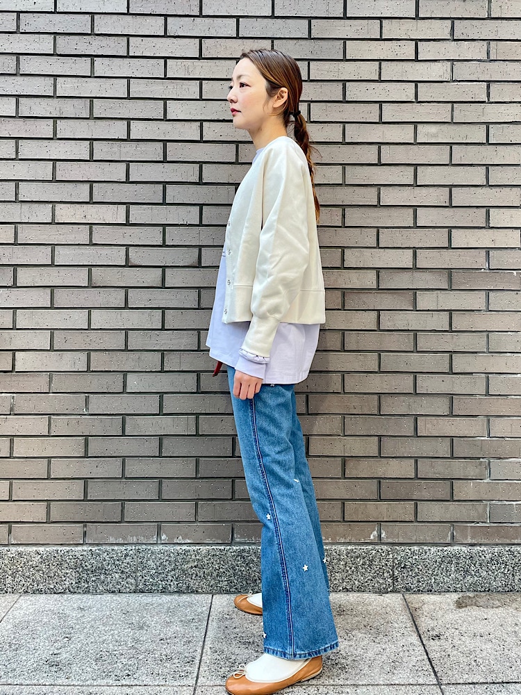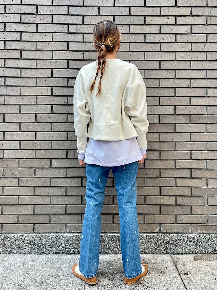 素材感・着心地:コットンの柔らかいデニム素材。腿周りはピッタリしており裾にかけ少しフレアのシルエットになっています。刺繍もポイントになり可愛いです