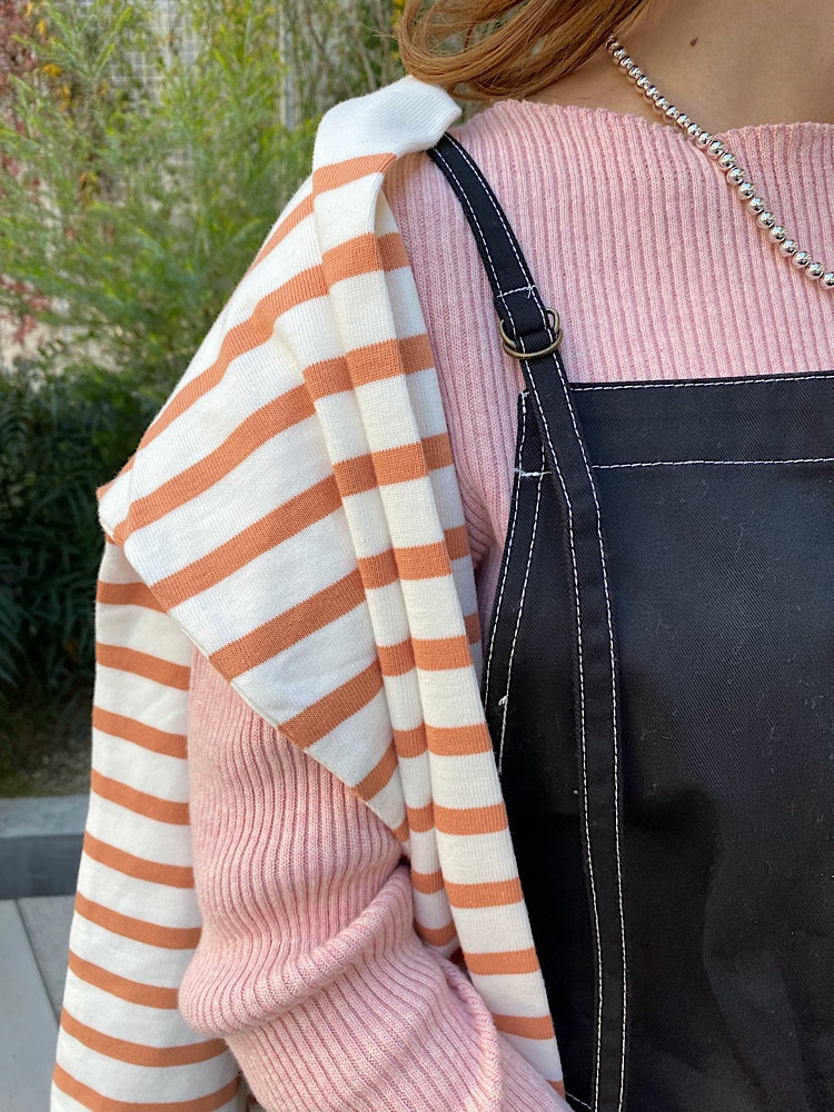 春カラーをポイントにオーバーオールの黒で締めました。