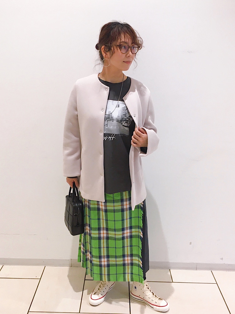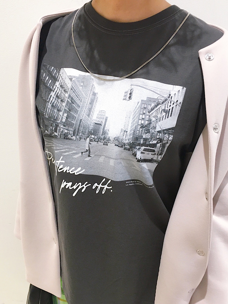 着心地:流行りのグラフィックTシャツは、身体のラインを拾い過ぎない、程よいゆったり感が◎