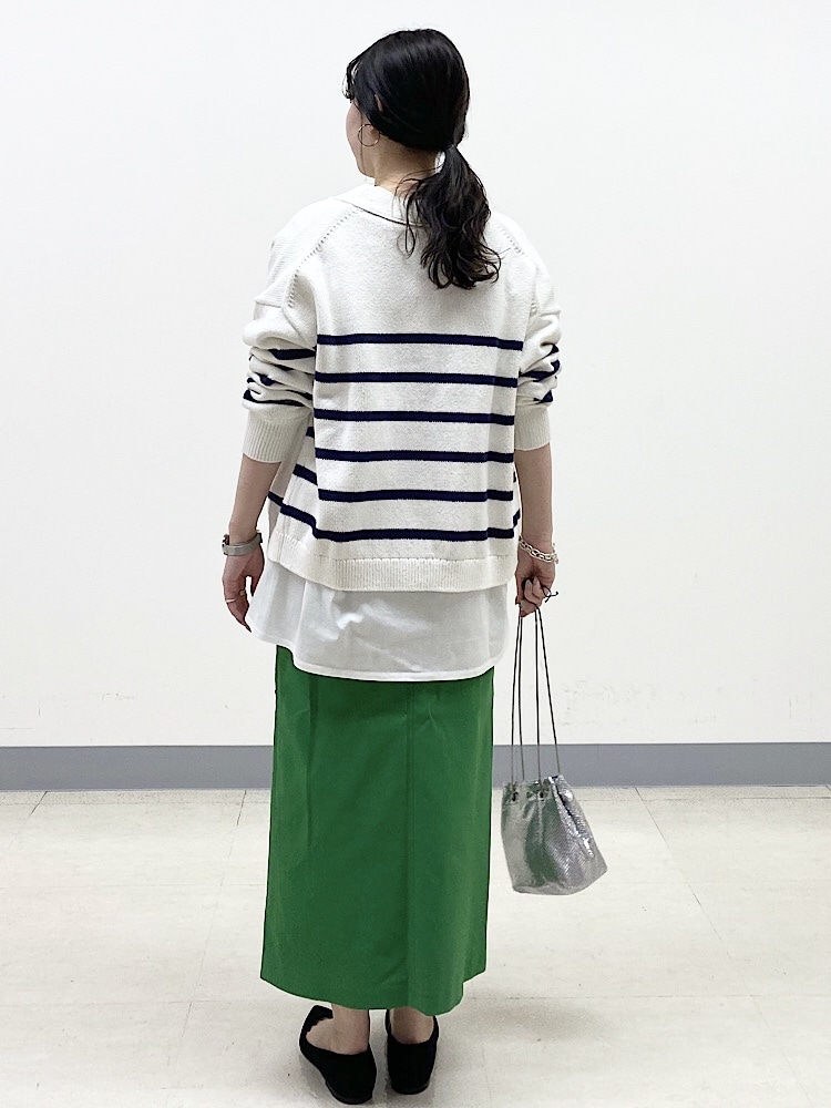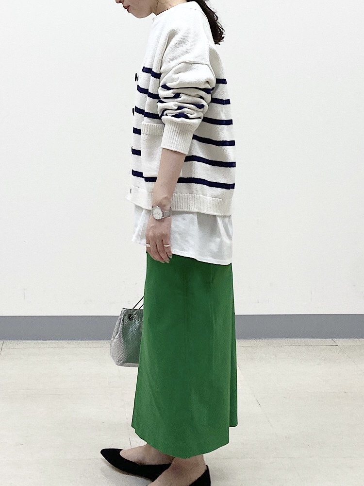 着心地:フロントにスリットがあり、女性らしさや美脚効果もある。お仕事使いで綺麗めに、またTシャツ合わせでカジュアルに、色々なシーンで使える。