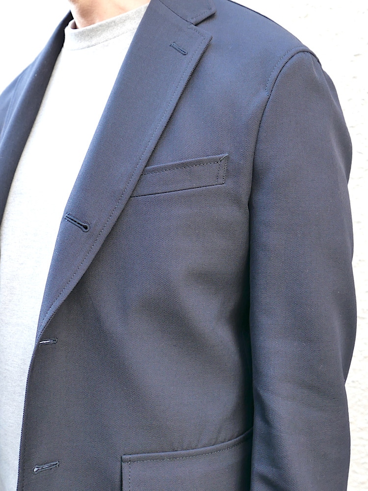素材感/着心地:シャリ感のあるウール素材の定番で使えるジャケットです。