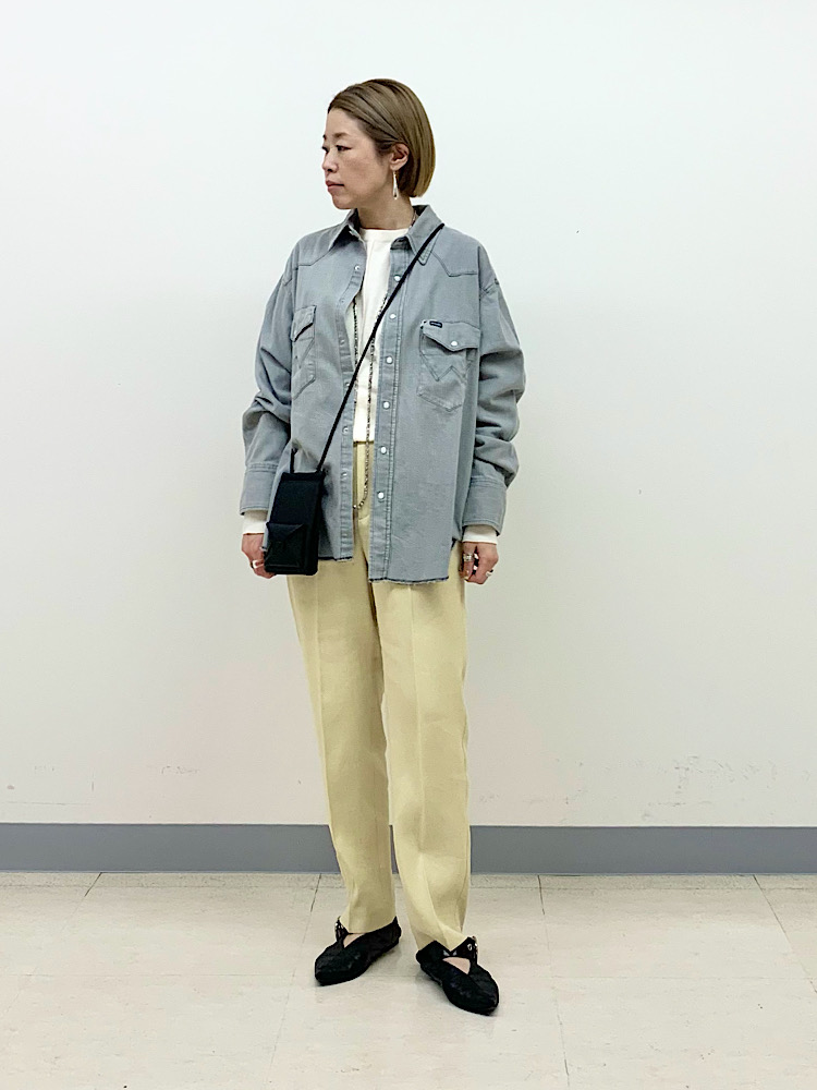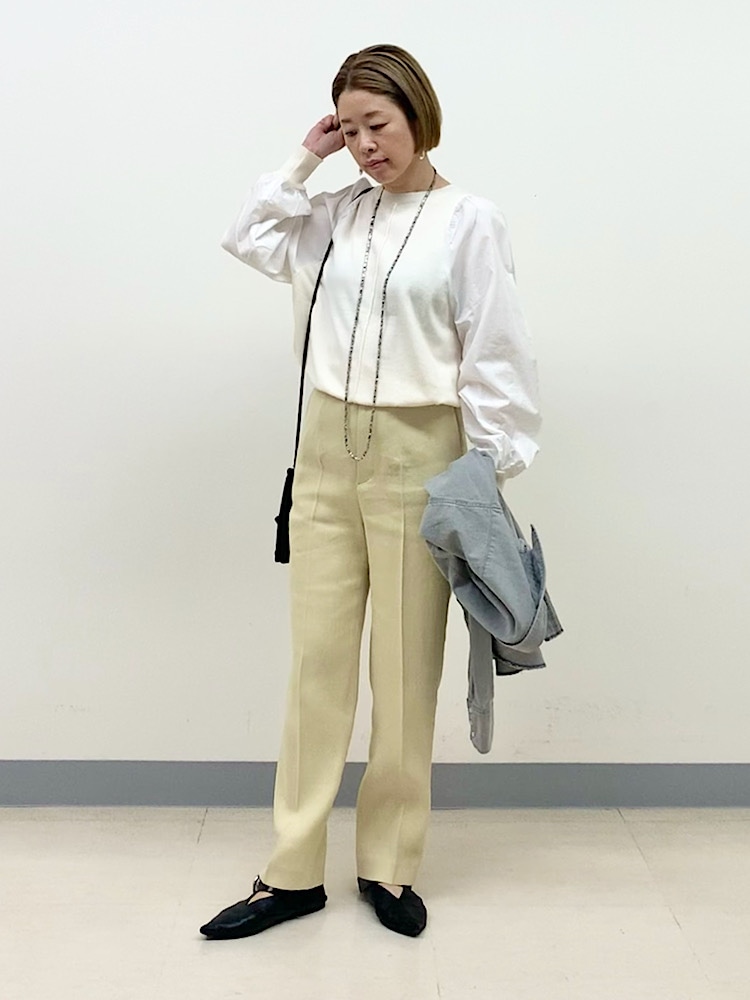 サイズ感:身頃はすっきりですが、フィットはしない適度なゆとり。着丈もコンパクトながら、短すぎないので、インにしなくても着られ、ボリュームのあるボトムスと相性◎