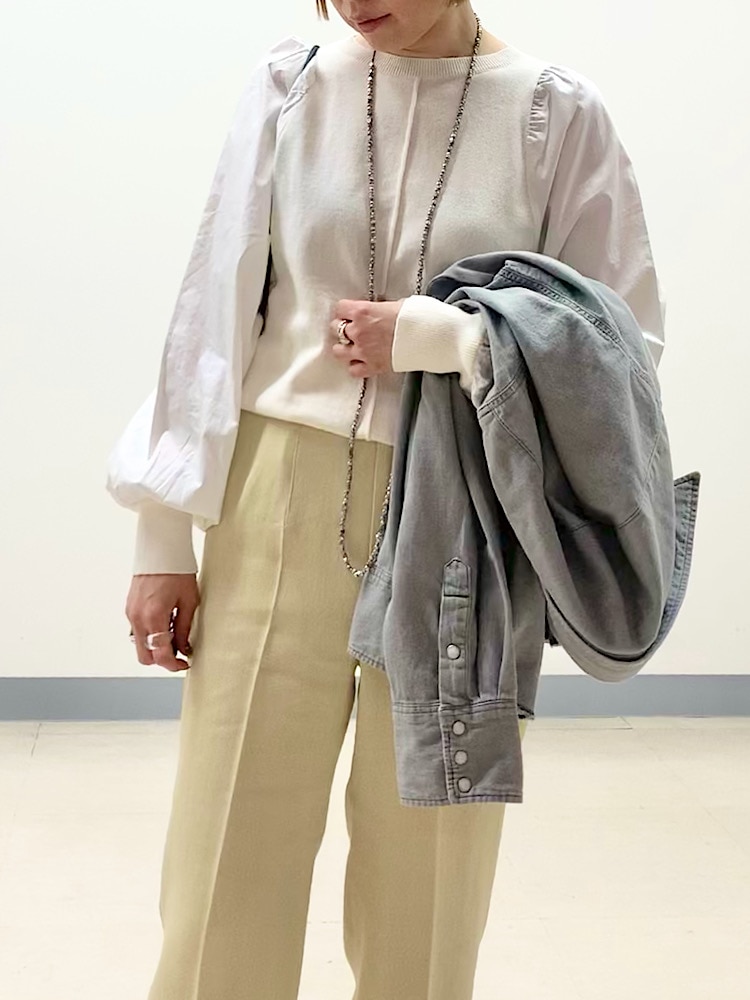 サイズ感:ゆったりしたオーバーサイズ。今回のように、ボリュームのある袖でも問題なく着られる程。軽いコート代わりにできます。