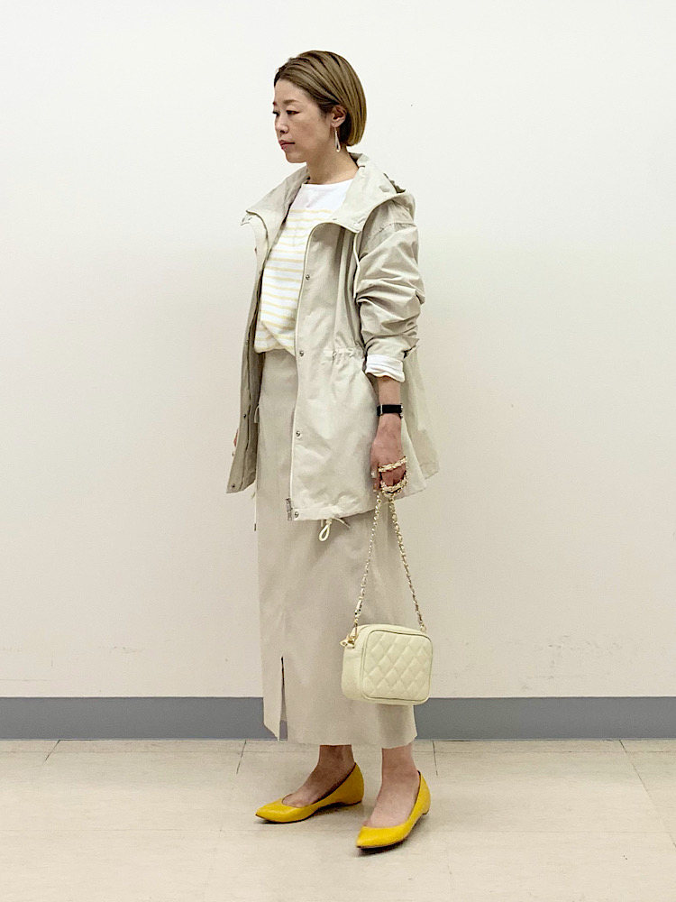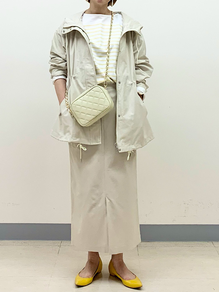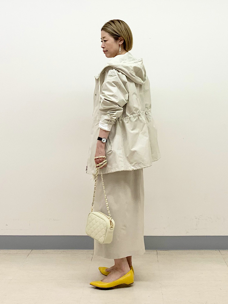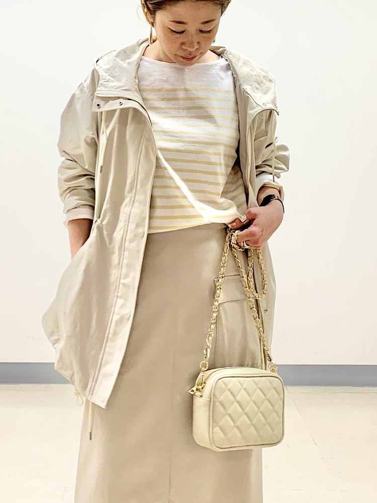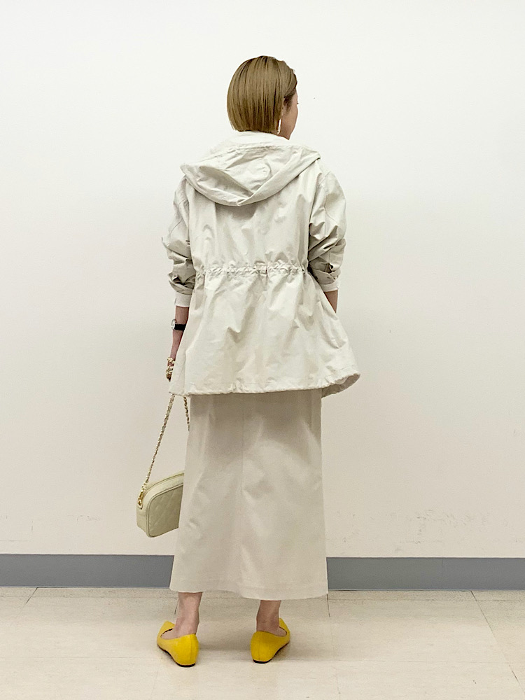 オフホワイト〜ベージュの淡いワントーンでまとめ、スポーティなアウターを女性らしい印象にコーディネート。