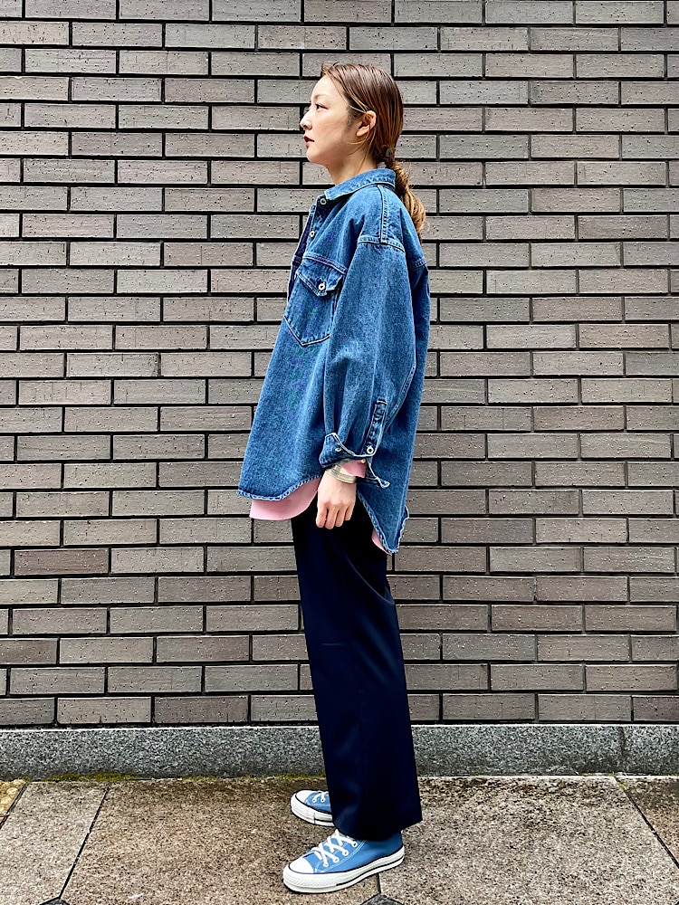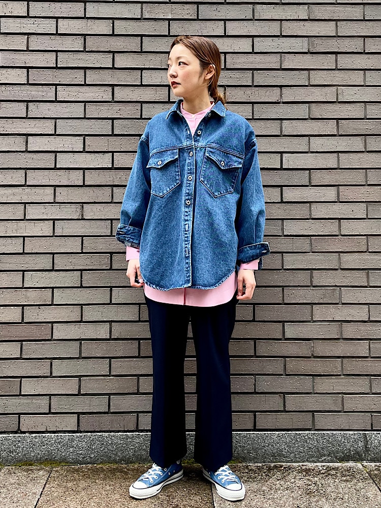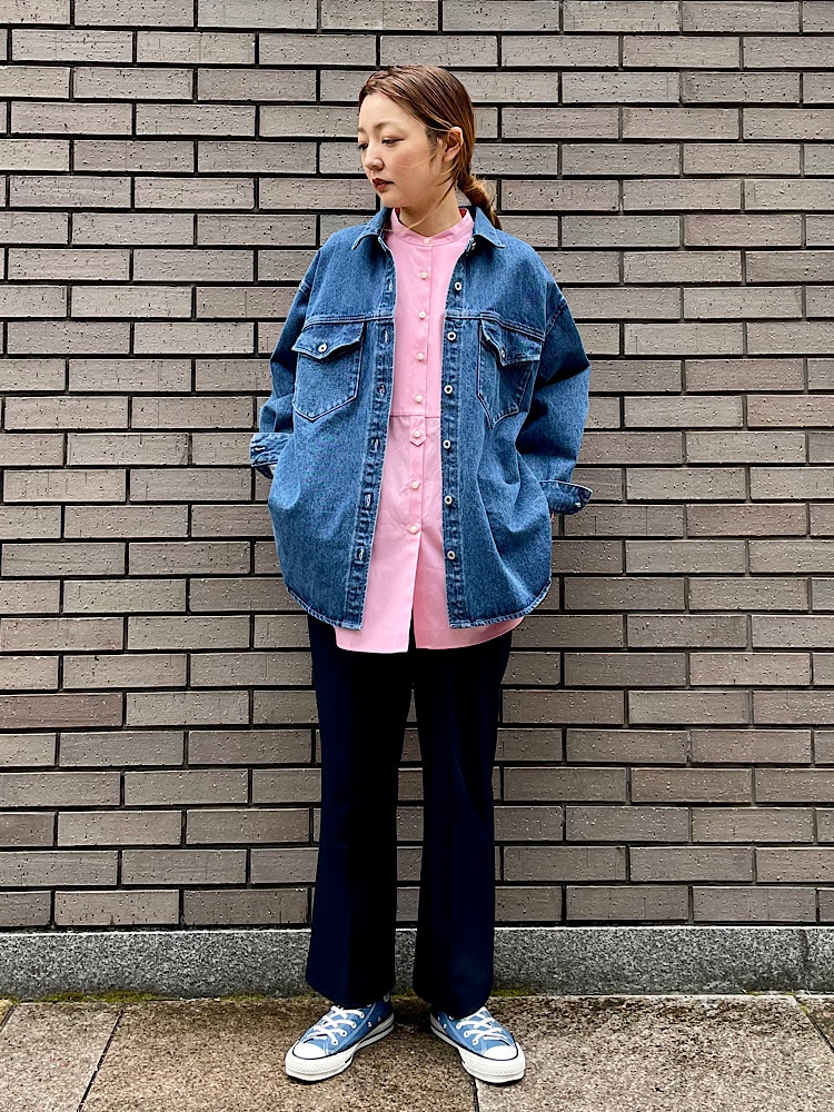素材感・着心地:コットンのやや厚みのあるデニム素材。シャツ型のジャケットです。肩周り、身幅がゆったりしている為、インナーを選ばず着用できます