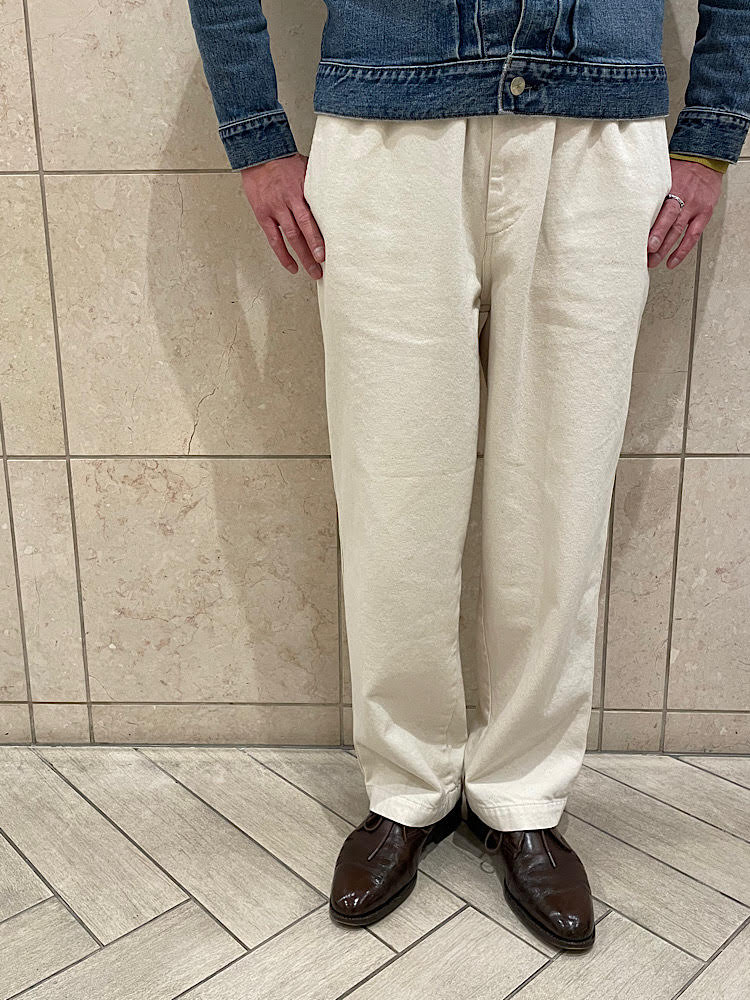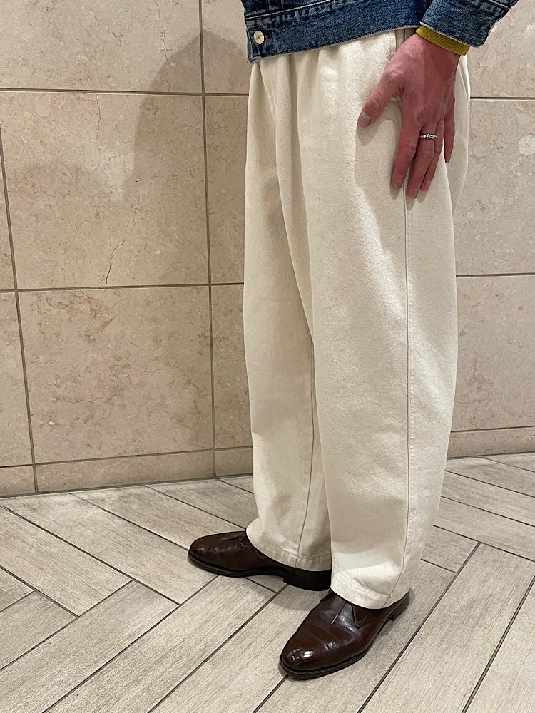 春先を意識したカラーコーディネート。ホワイトデニムは程良いワイドシルエットが特徴的で、短丈のブルゾン、ジャケットとの相性が抜群です。 【着用レビュー 】 着用アイテム :パンツ 身長:174cm / 普段サイズ:L/ 着用サイズ:L サイズ感:適度にゆとりあるサイズ 素材感:デニムだが、柔らかい 着心地:ドローコード仕様で、楽に履ける