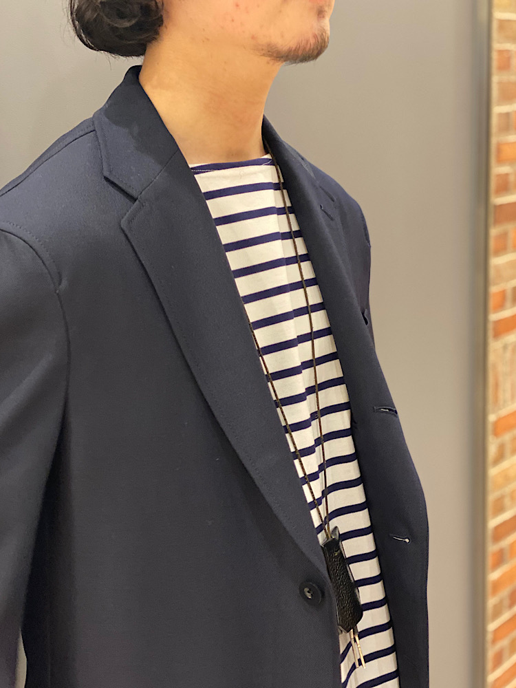 【素材感・着心地】コットン素材です。太過ぎないシルエットで、野暮ったくなりにくいです。今回のようにジャケット合わせが特にオススメです。