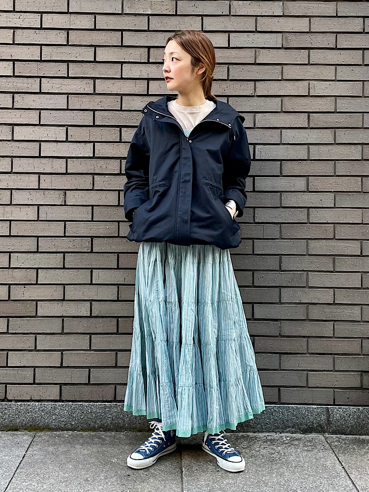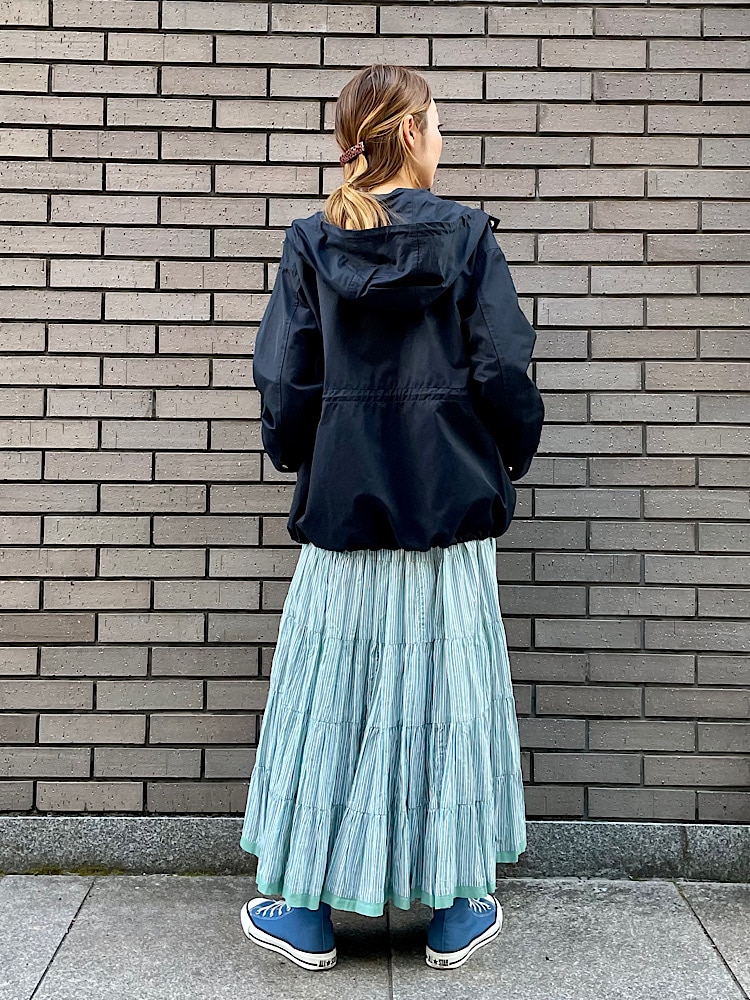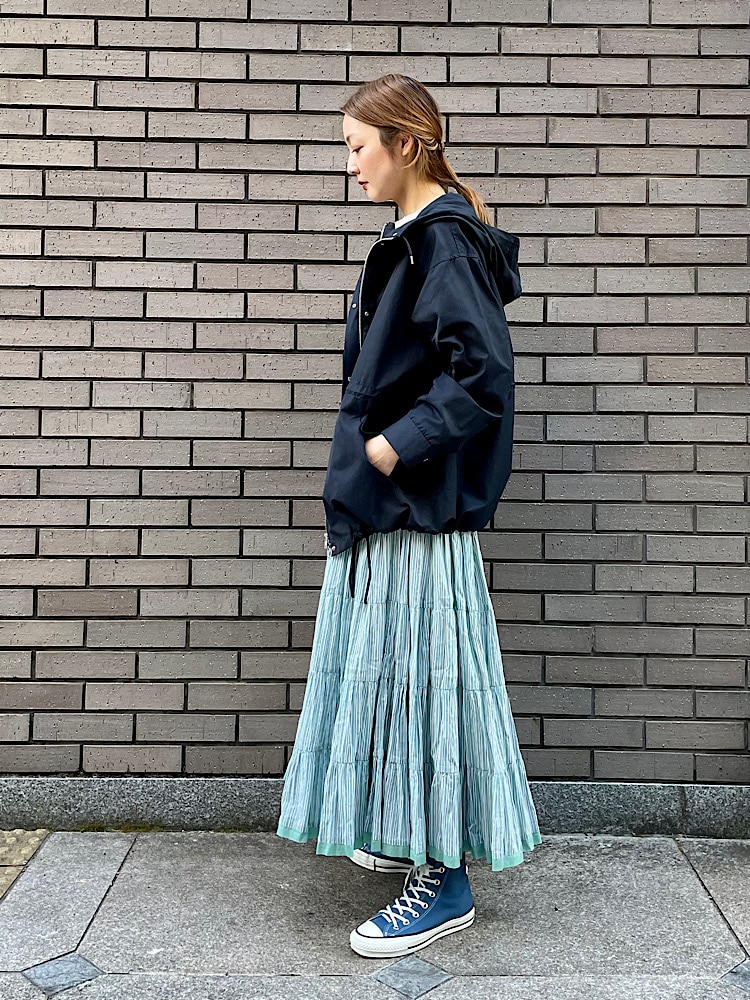素材感・着心地:コットン/ナイロンの少し光沢のある素材感。肩周り、身幅共にゆったりしている為、インナーを選ばず着用できます。また、ウエスト、裾に紐が通っておりボトムに合わせシルエットを調整できます