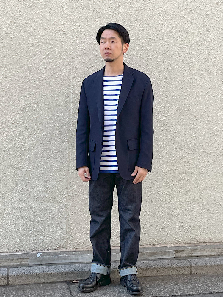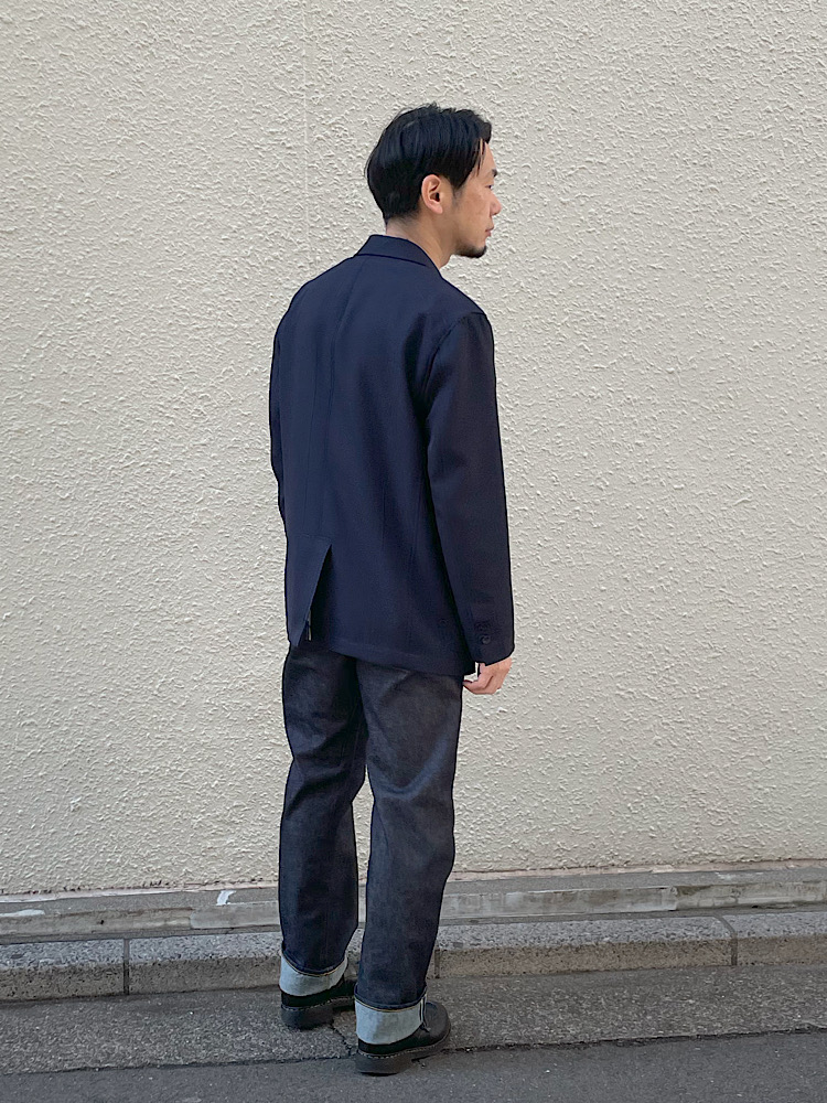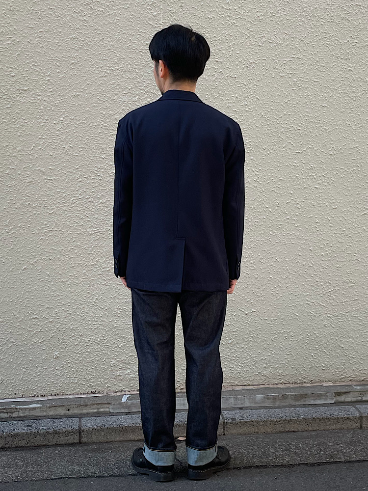 素材感/着心地:ポリエステル55%ウール45%の合繊素材。少し張りのある生地感。長く愛用できるネイビーブレザージャケット。