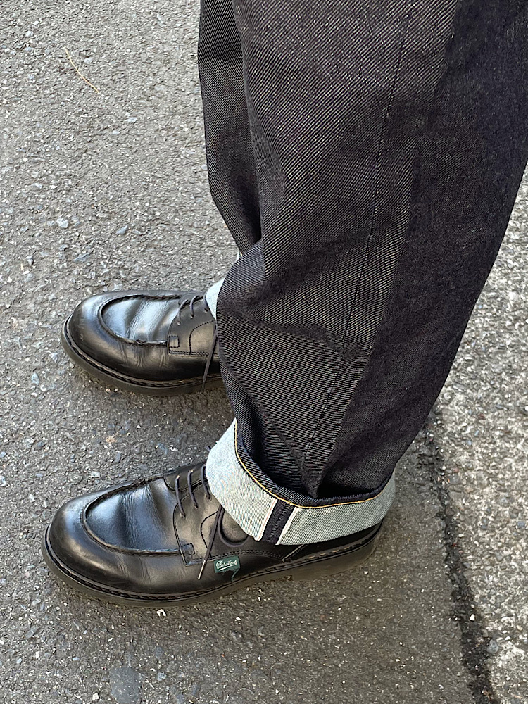 素材感/着心地:コットン100%。スーピマコットンを使用したセルビッジデニム。履き込んで色落ち等、経年変化を楽しめるアイテム。