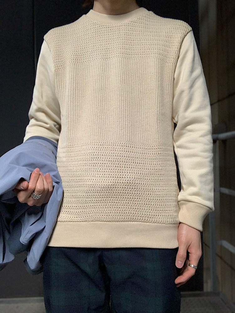 素材感:ボディには交差した編地が特徴のバスケット編みと伸縮性に富んだ片畦編みを組合わせ、袖・後身頃には超長綿の30/10裏毛スウェットを使用した異素材ドッキング。