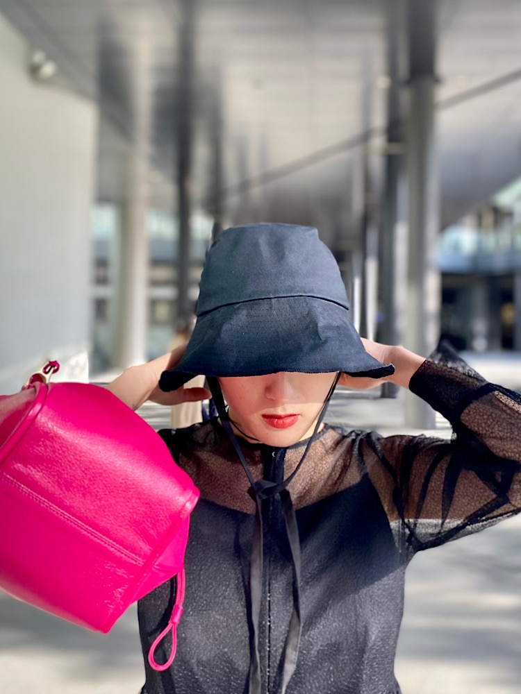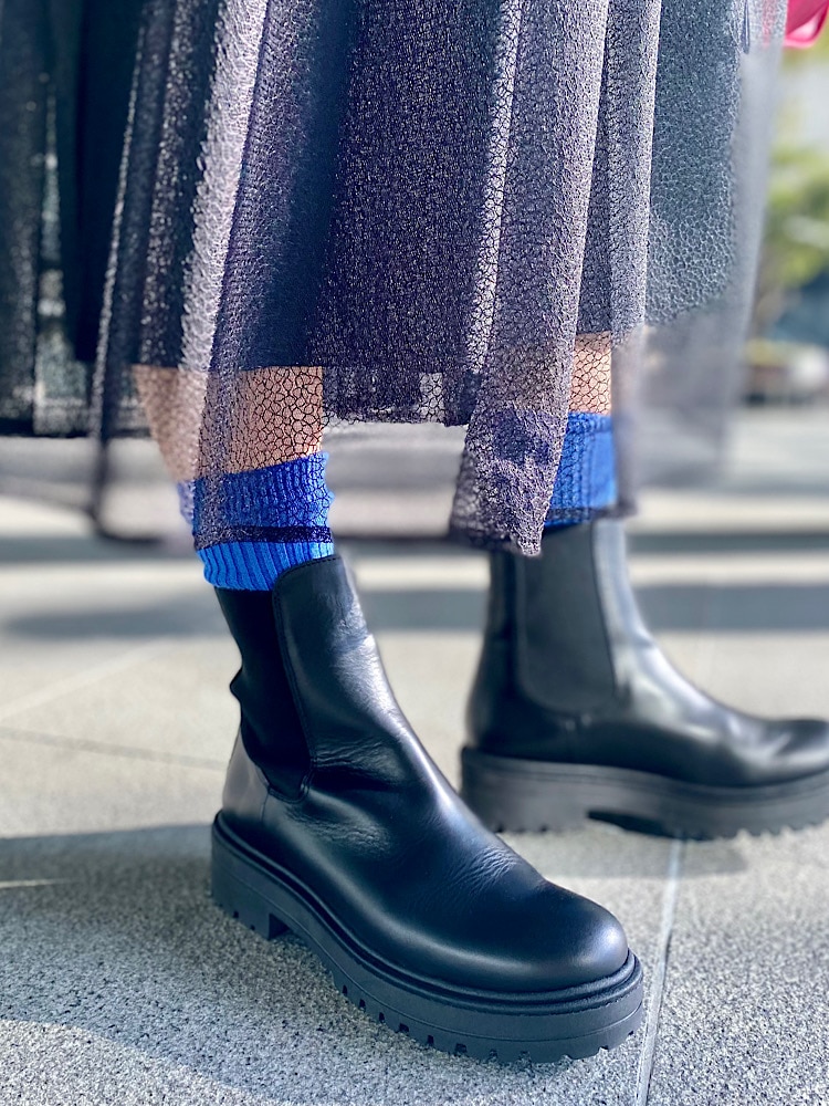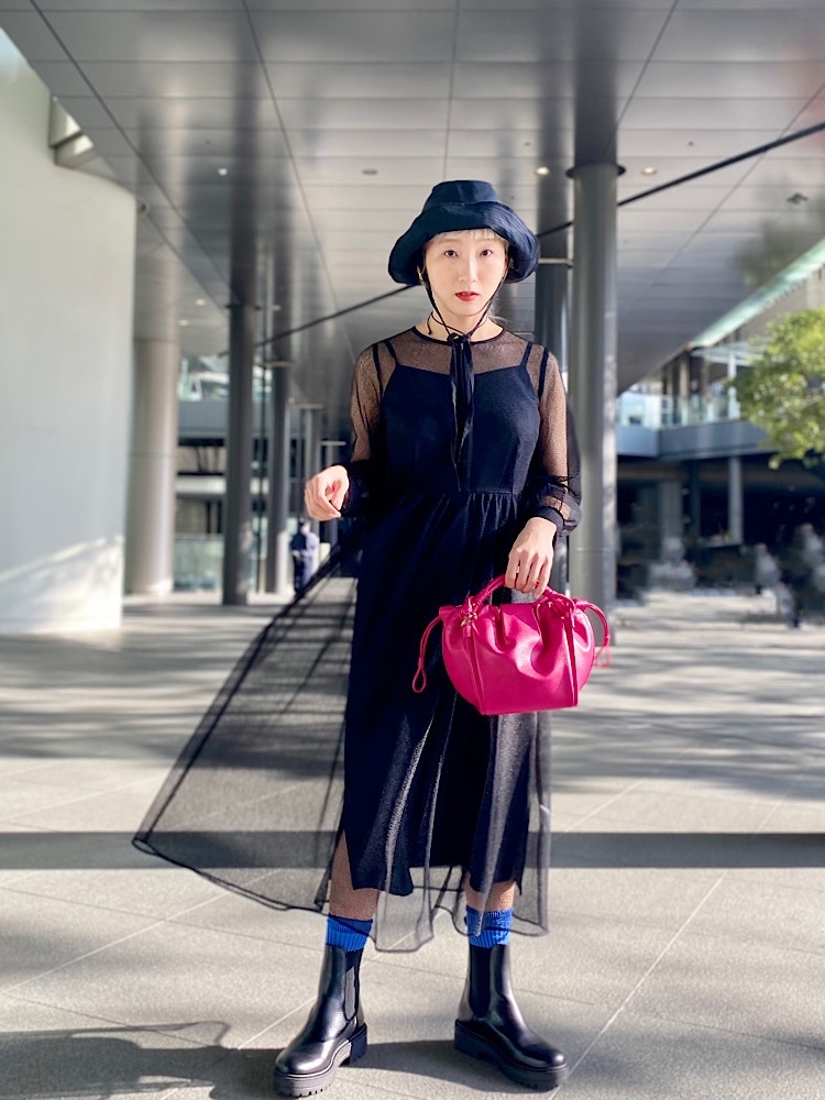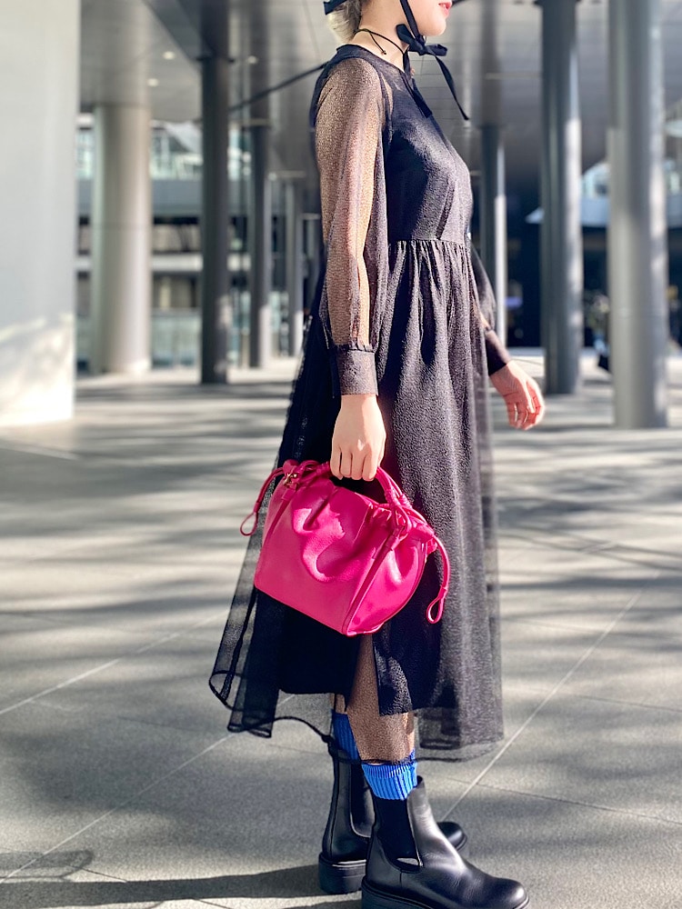 ・着こなしポイント: シアー感をいかし、ソックスやバッグでカラーものをプラスしました