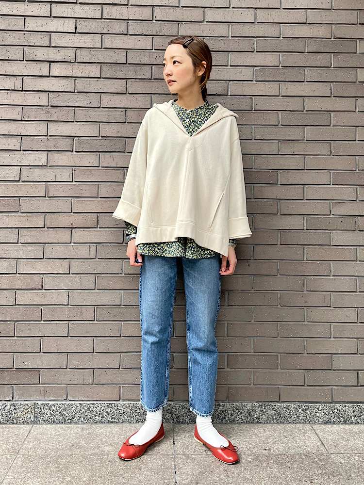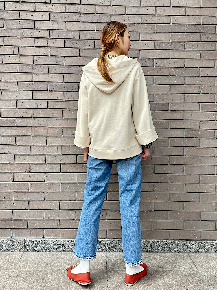 素材感・着心地:コットンの柔らかい素材感。腰周りはピッタリしています。ベーシックなストレートのシルエットでトップスを選びません