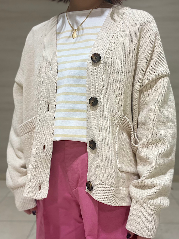 着心地:生地がとてもしっかりしているカーディガンですので、晩冬〜初夏まで長いシーズンお使いいただけます。