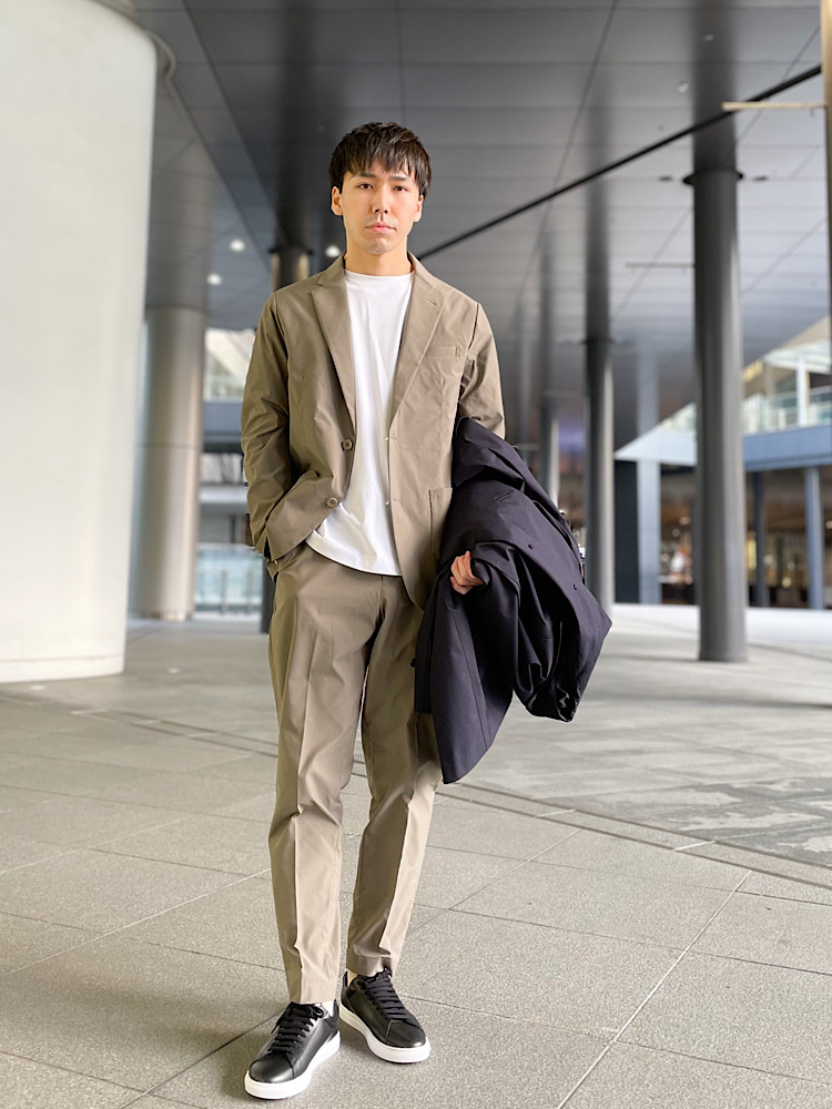 サイズ感:3点で1つの商品です。3点共にジャストのサイズ感で、さらっととした生地感で気軽に手に取って頂きやすいセットアップです。