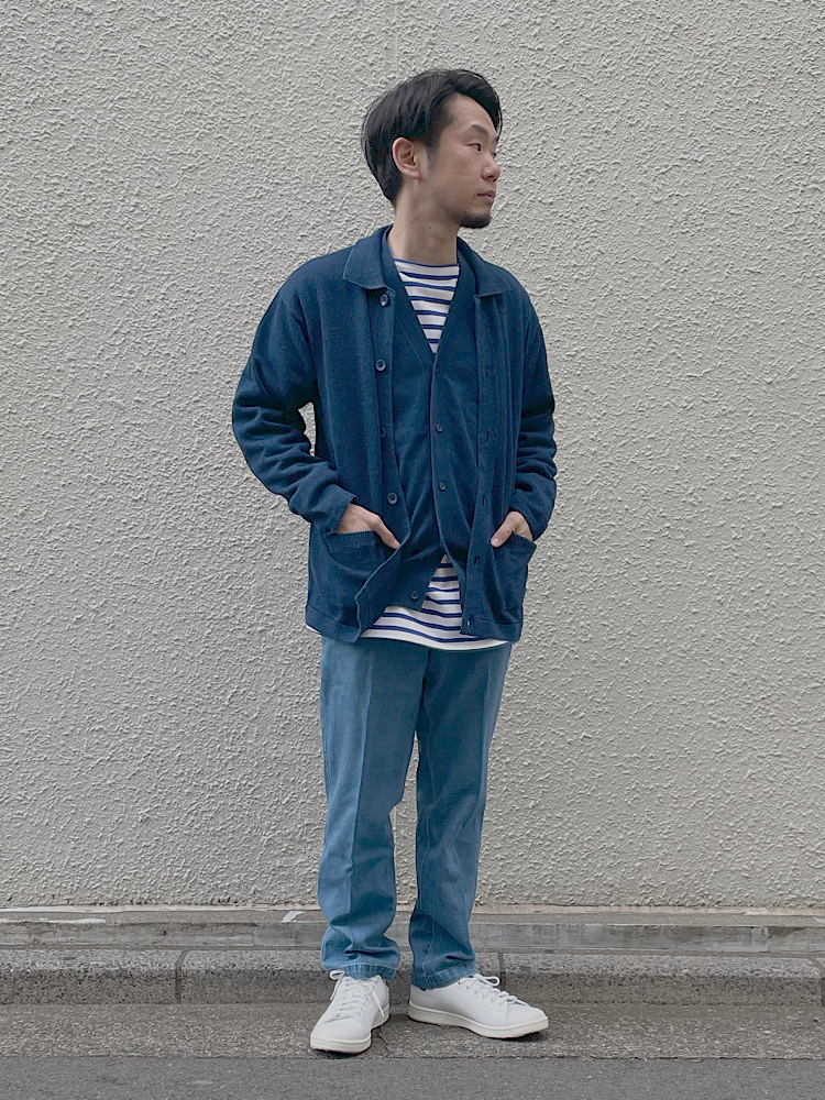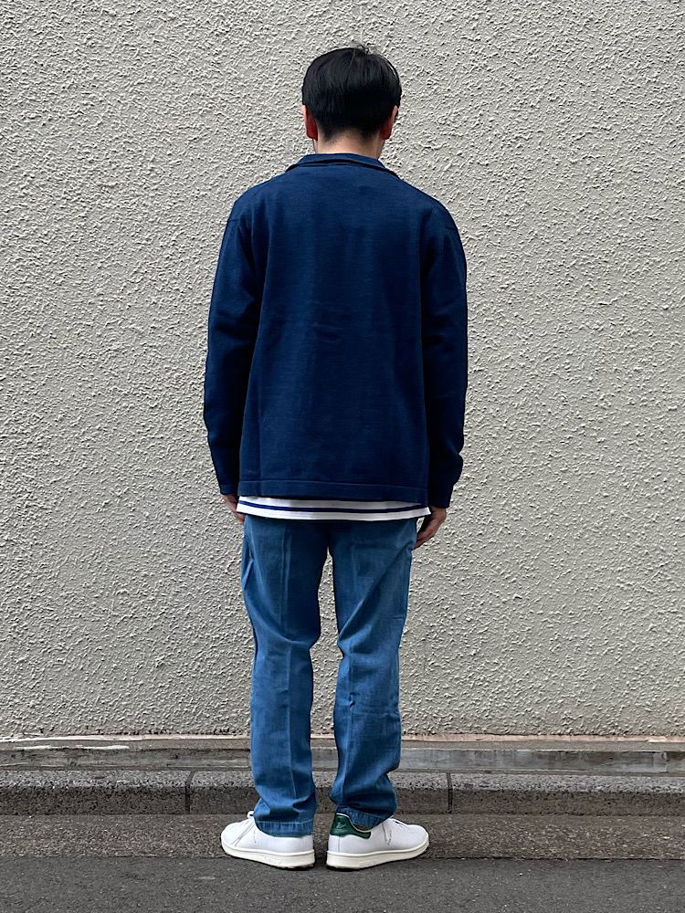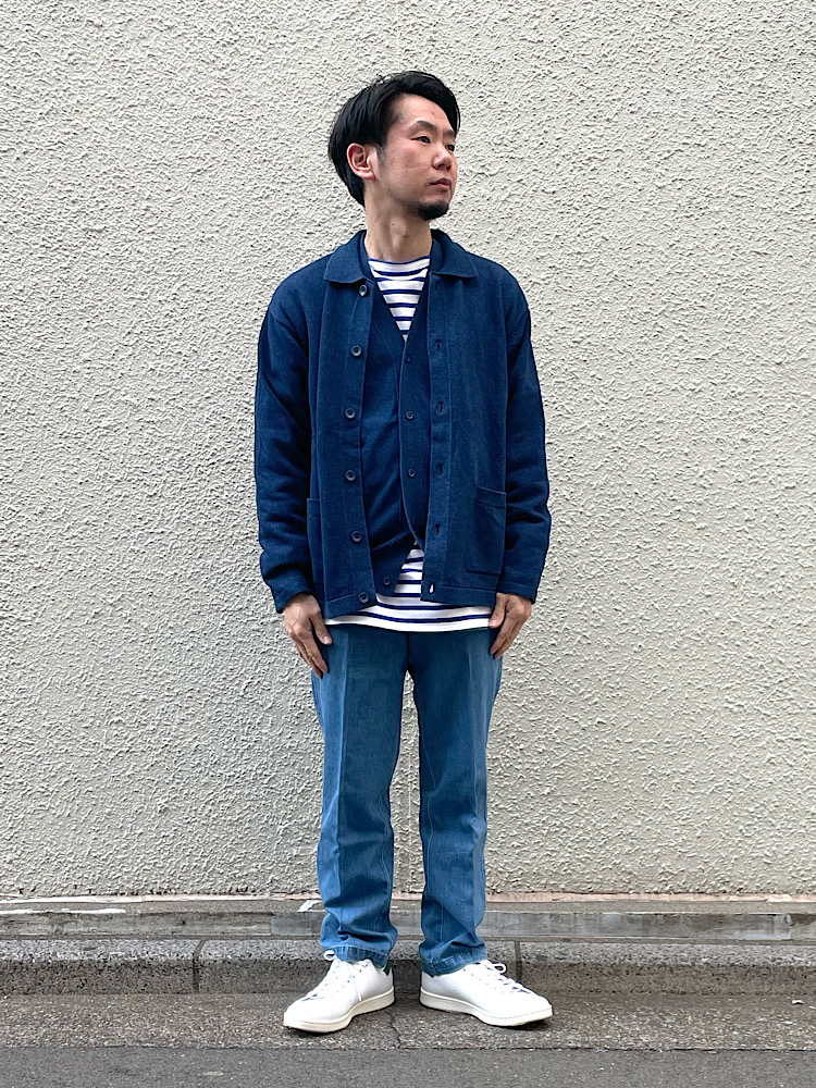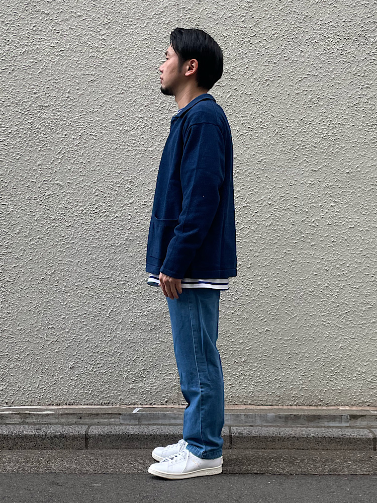 素材感/着心地:コットン100%。柔らかく着やすい。インディゴ糸を使った生地なので経年変化を楽しんでいただけるアイテムです。