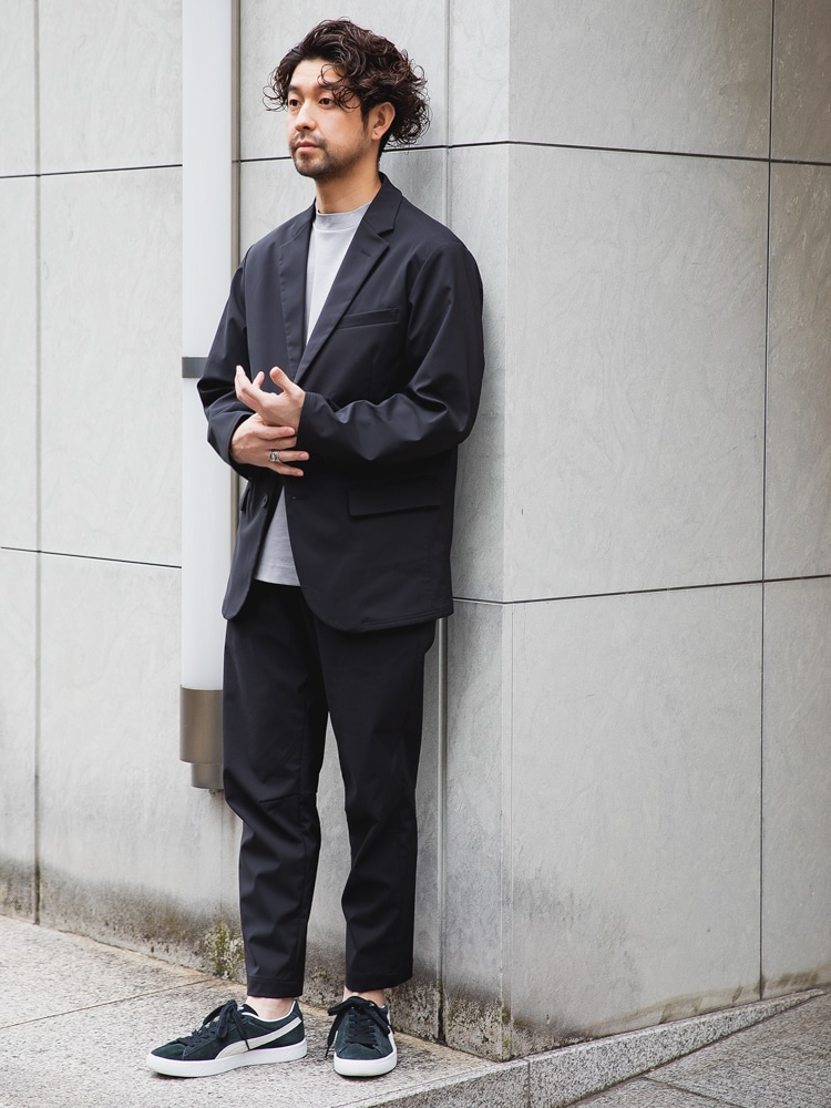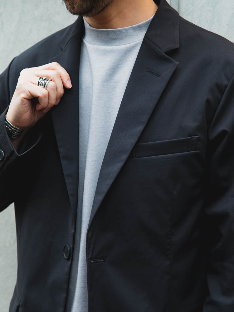 GORE-TEXのハイテクな素材感を活かしたシンプルなビジカジコーデ。
