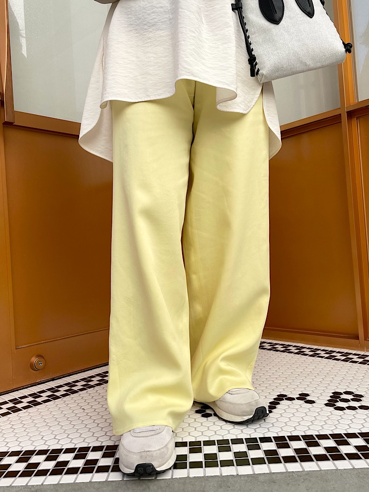 商品紹介:裏地が着いていないサラッとした生地感で肌あたりがよかったです。色味も春らしくシンプルなトップスに合わせると一気に春らしいコーディネートになります。
