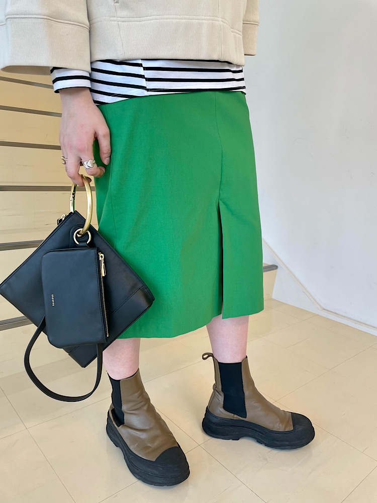 【素材感・着心地】ストレッチがとても効いてるのでタイトスカートながら足捌きが良い。