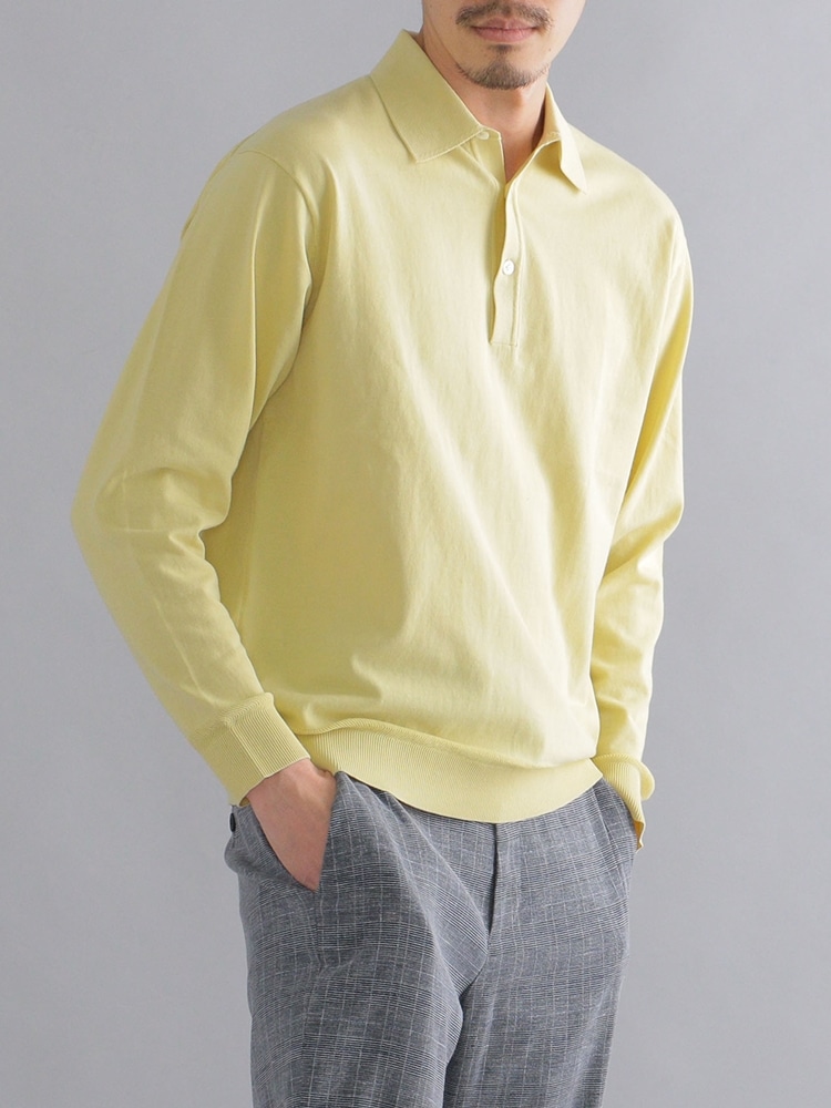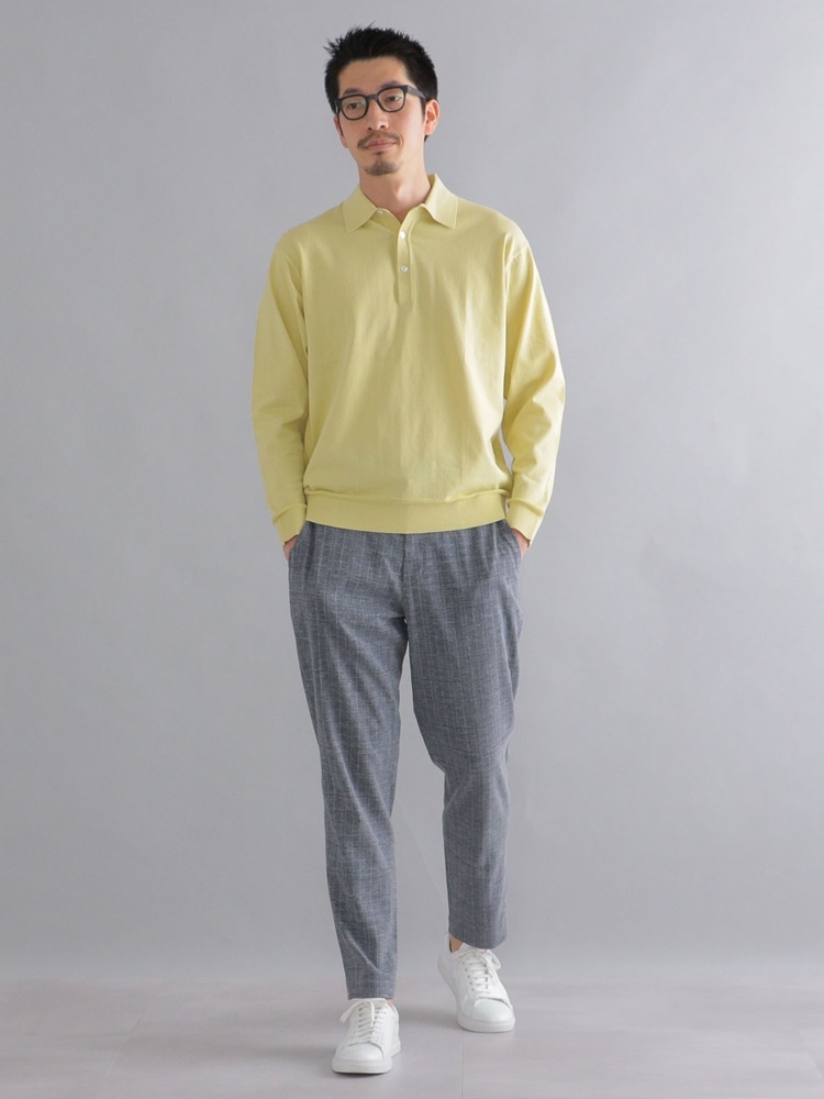 イエローのポロシャツが目を惹く、遊び心のあるビジネスカジュアルスタイル。