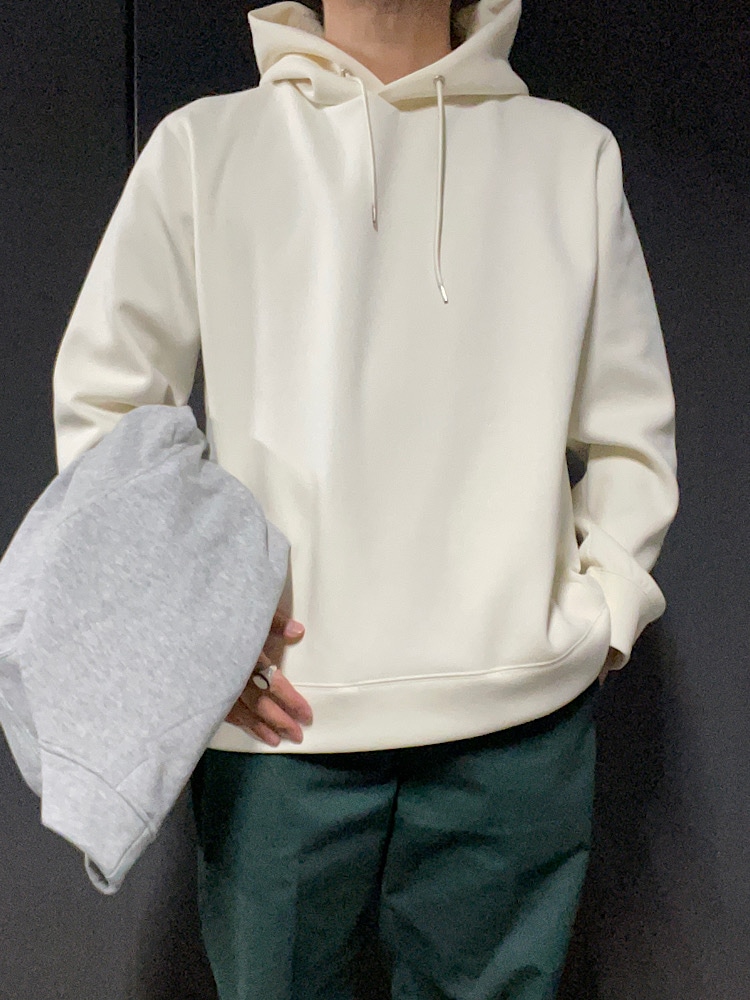 素材感・着心地:着回ししやすい程良い肉感、一枚着でもインナーでも着用可能な汎用性の高いパーカーです。