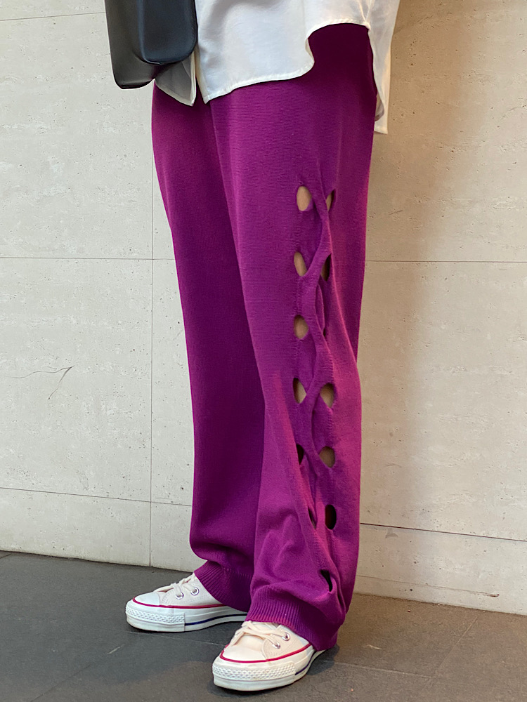 着心地:サイドのデザインが素敵なパンツです。ワンピースと合わせて裾だけ見せたコーディネートもおすすめです。