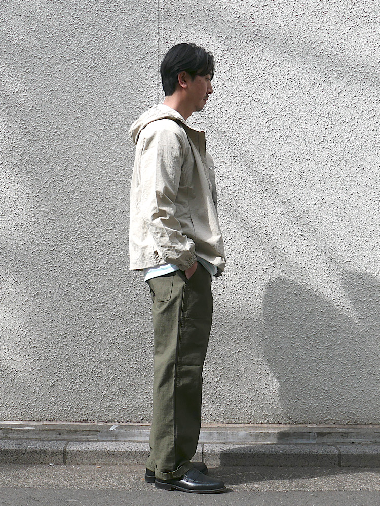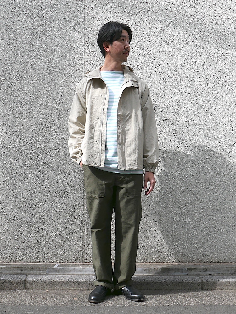 フレンチボーダーにワークテイストを合わせたミックスコーディネートです。カジュアルになり過ぎないように足下はレザーシューズです。