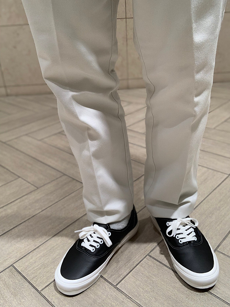 サイズ感:脚の綺麗なラインが出るようにややテーパードをかけ、それに合わせて股上もやや短くしたパターン。