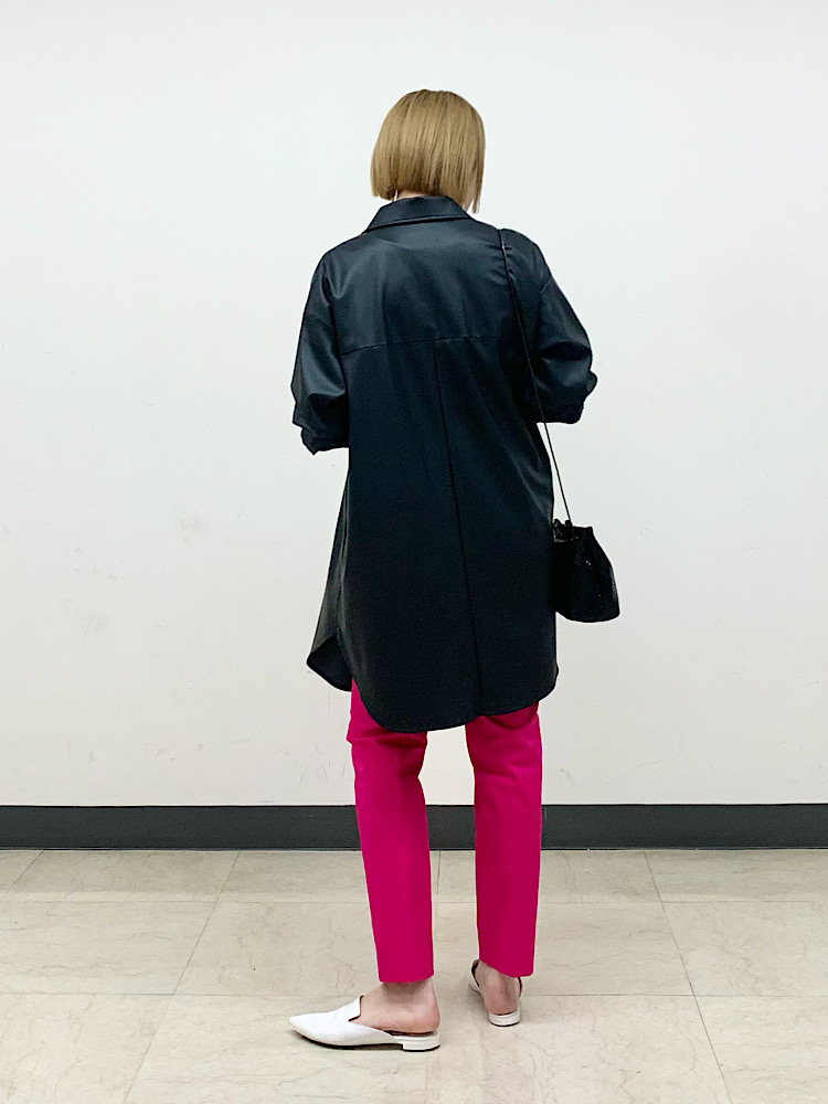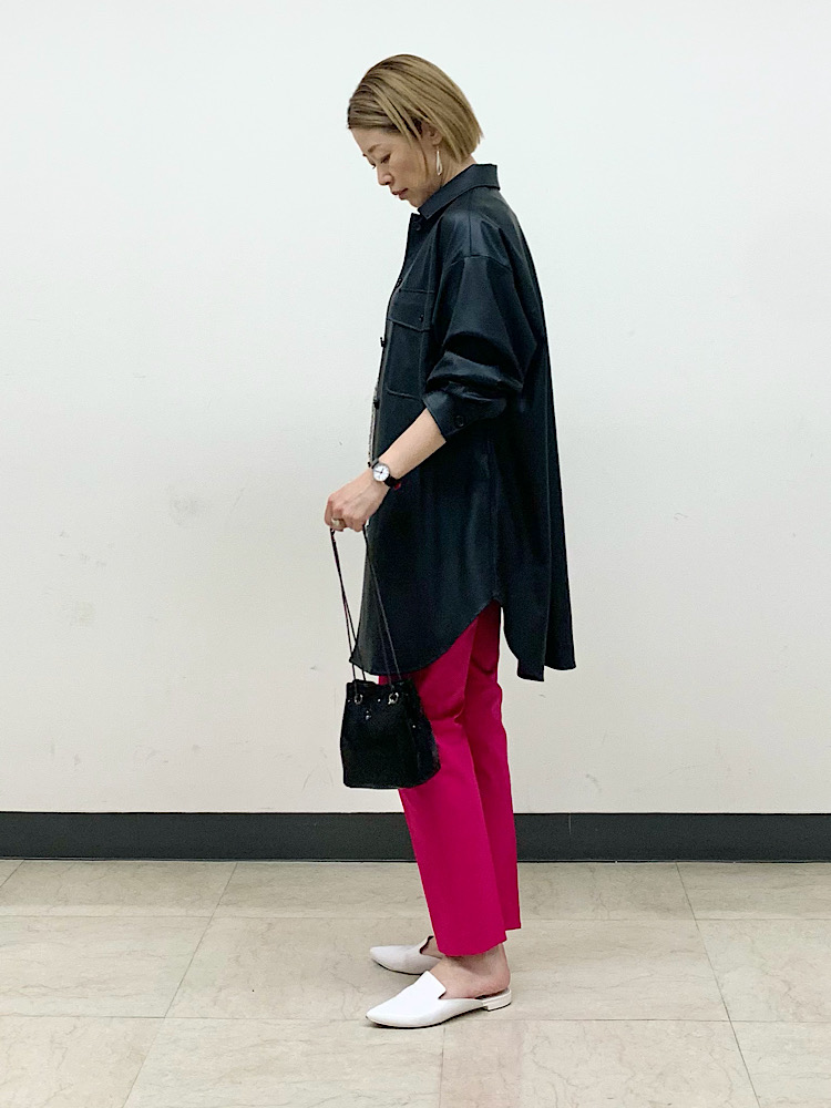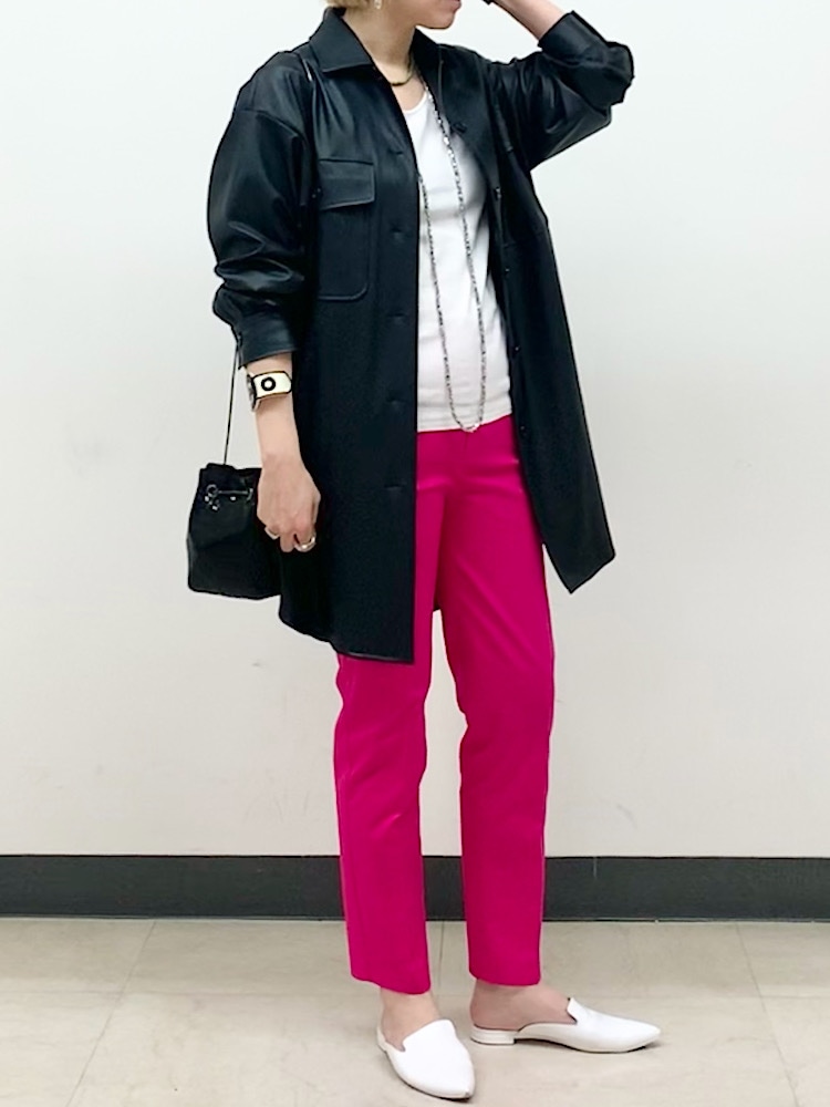発色が綺麗なパンツ。存在感抜群の色ものは、ベーシックアイテムで取り入れるのがおすすめです。