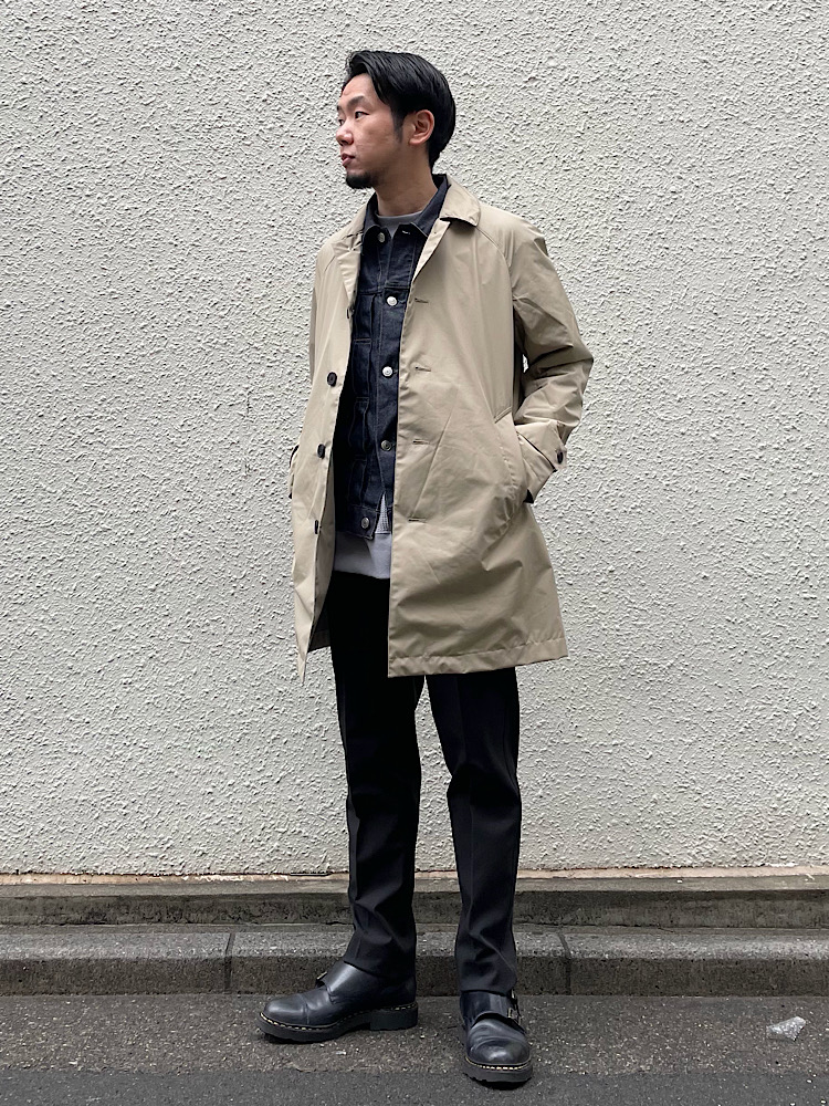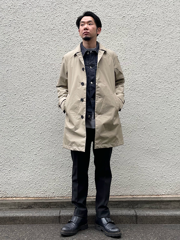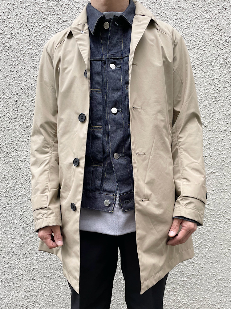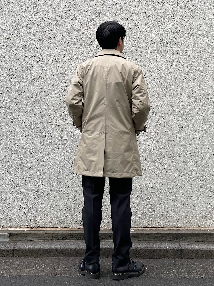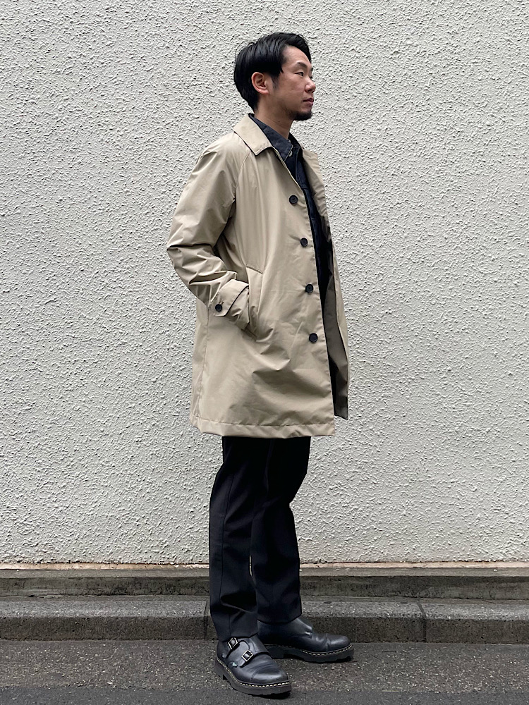 素材感/着心地:ポリエステル100%。ゴアテックスを使用したステンカラーコート。軽くて着やすい。