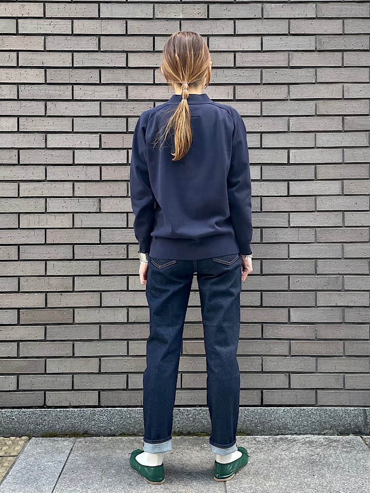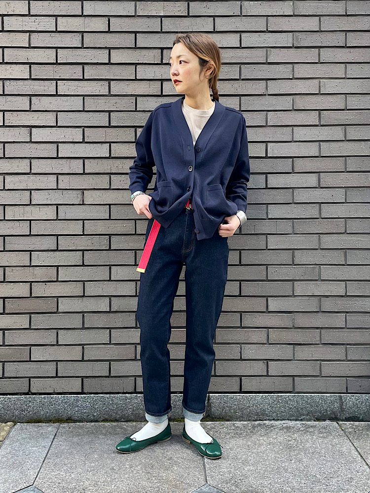 素材感・着心地:比較的薄手のデニム素材です。裾にかけて細くなるテーパードのシルエットですが、伸縮性がある為、履きやすいです。(ぴったりしたシルエットが苦手なのでワンサイズあげて着用しています)