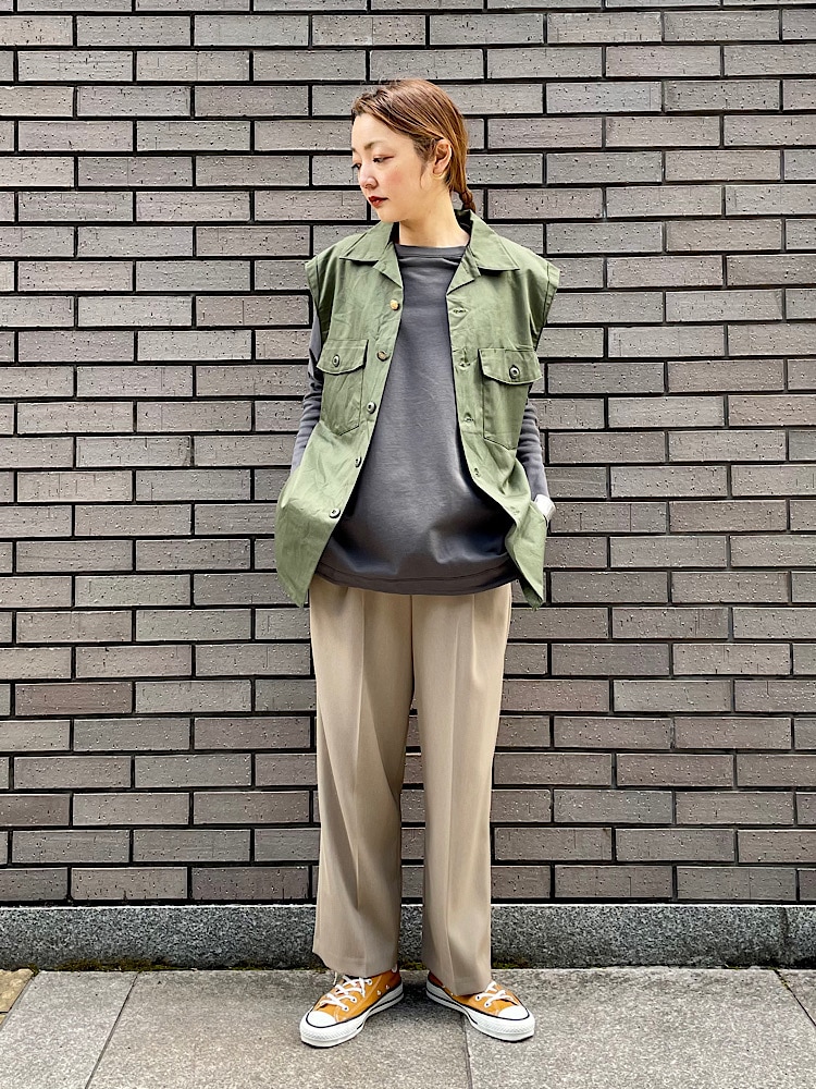 素材感・着心地:ポリエステルのさらりとした素材感。ストレッチも効いており着用しやすいです。セミワイドで落ち感のある綺麗なシルエットです