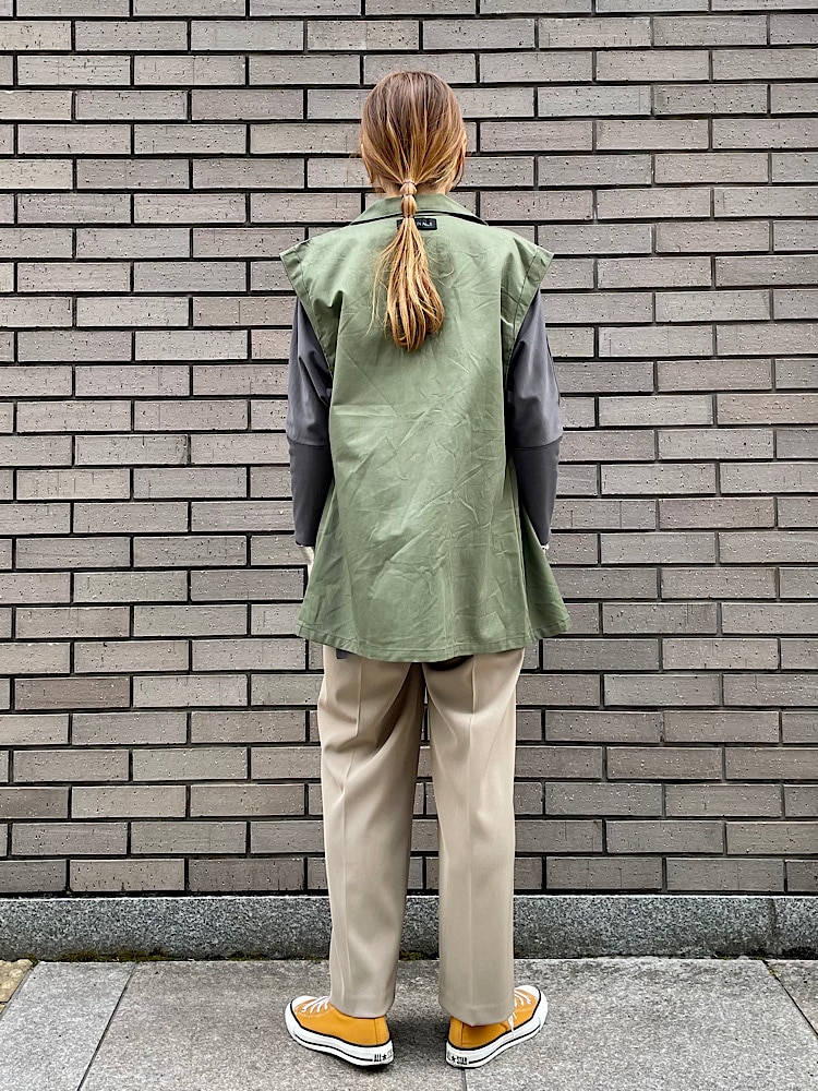 素材感・着心地:コットンの少しハリのある素材感。身幅はゆったりとしており、厚手のインナーの上からも着用が可能です。上3つはビンテージのボタンを使用しておりアソートになっています