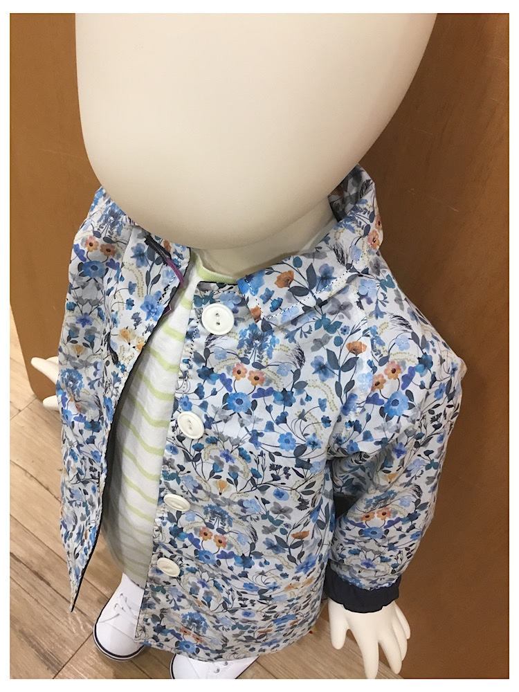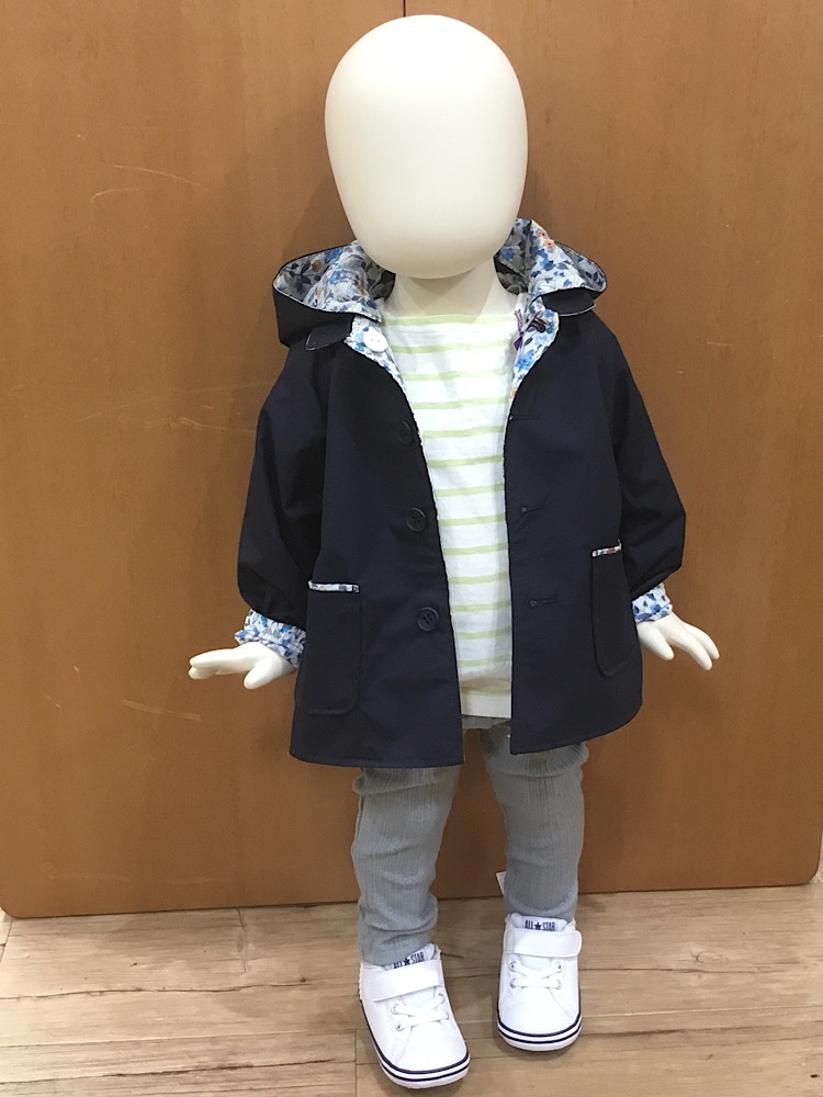 毎年大人気のリバティコートのコーディネートです。今回は紺色をご紹介します!紺色は花柄でも甘くなりすぎない落ち着いた印象になります♪