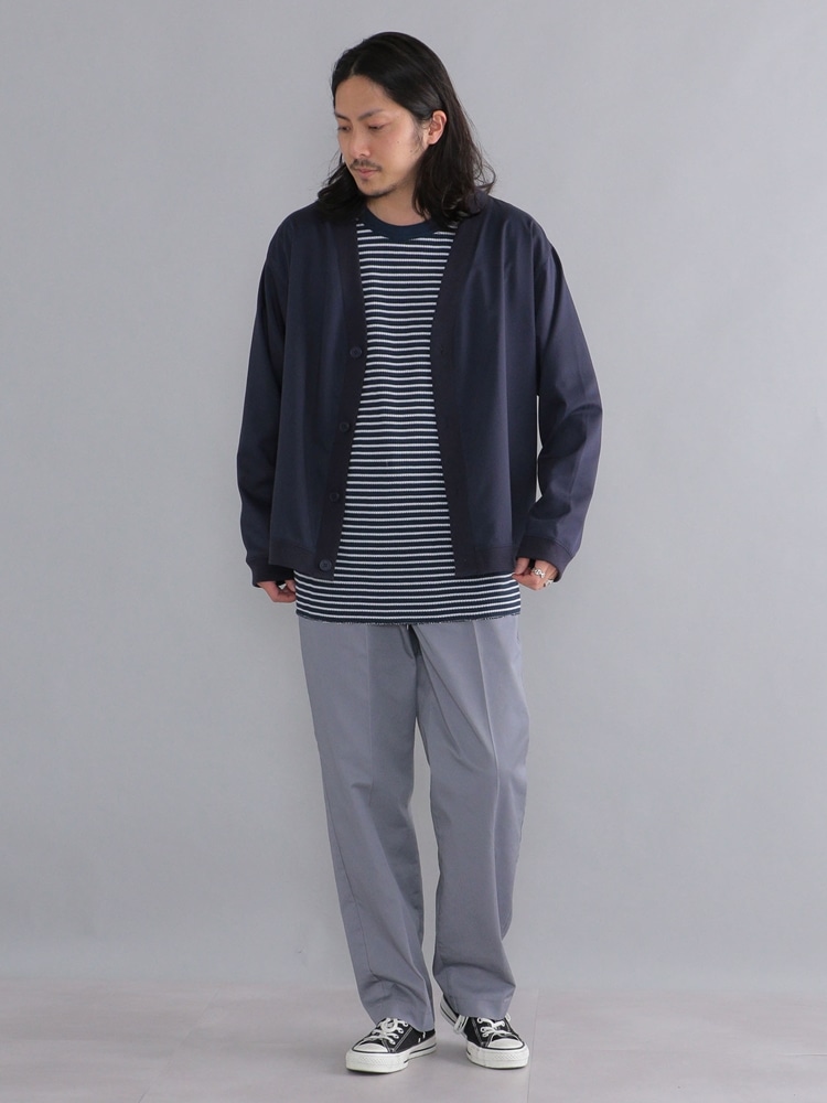 サイズ感:身幅に程よいゆとり感を持たせており、1枚でもインナーとしても重宝するシルエット。