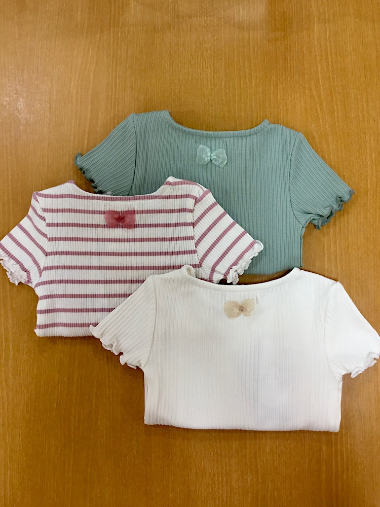 優しいグリーンが女の子らしいアイテム。 定番のリブTシャツの春の新色が揃いました。