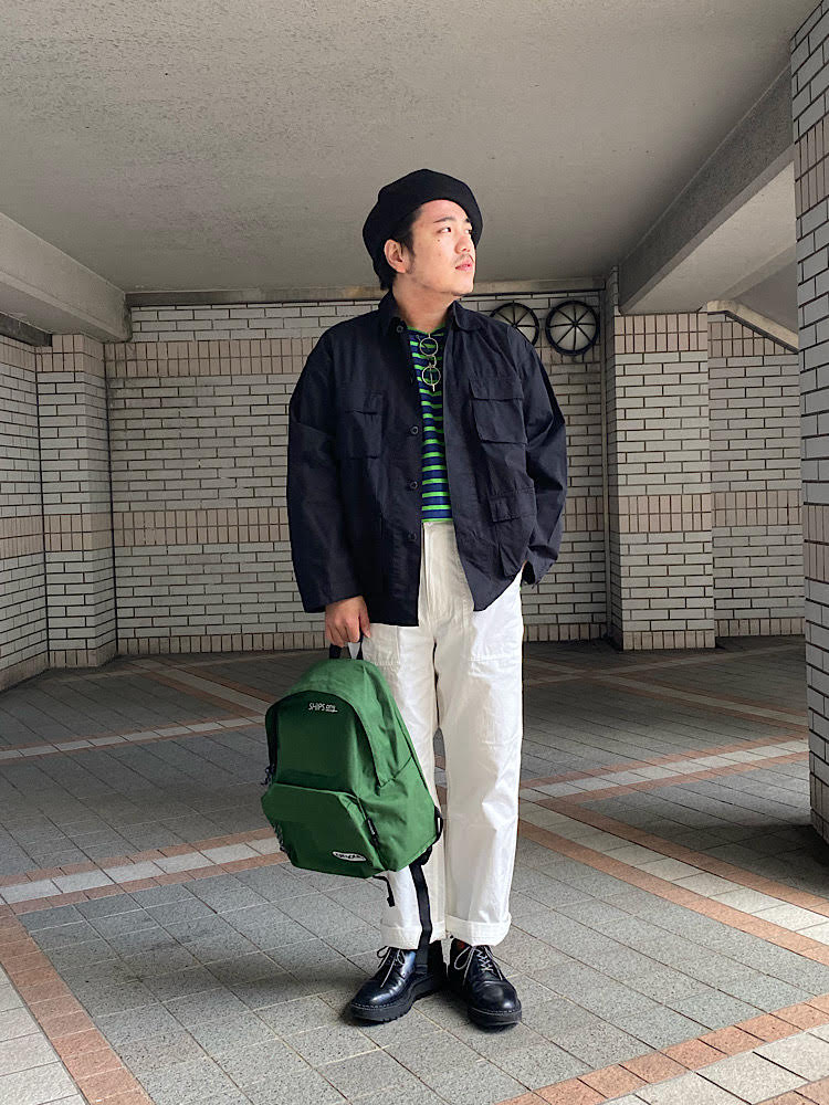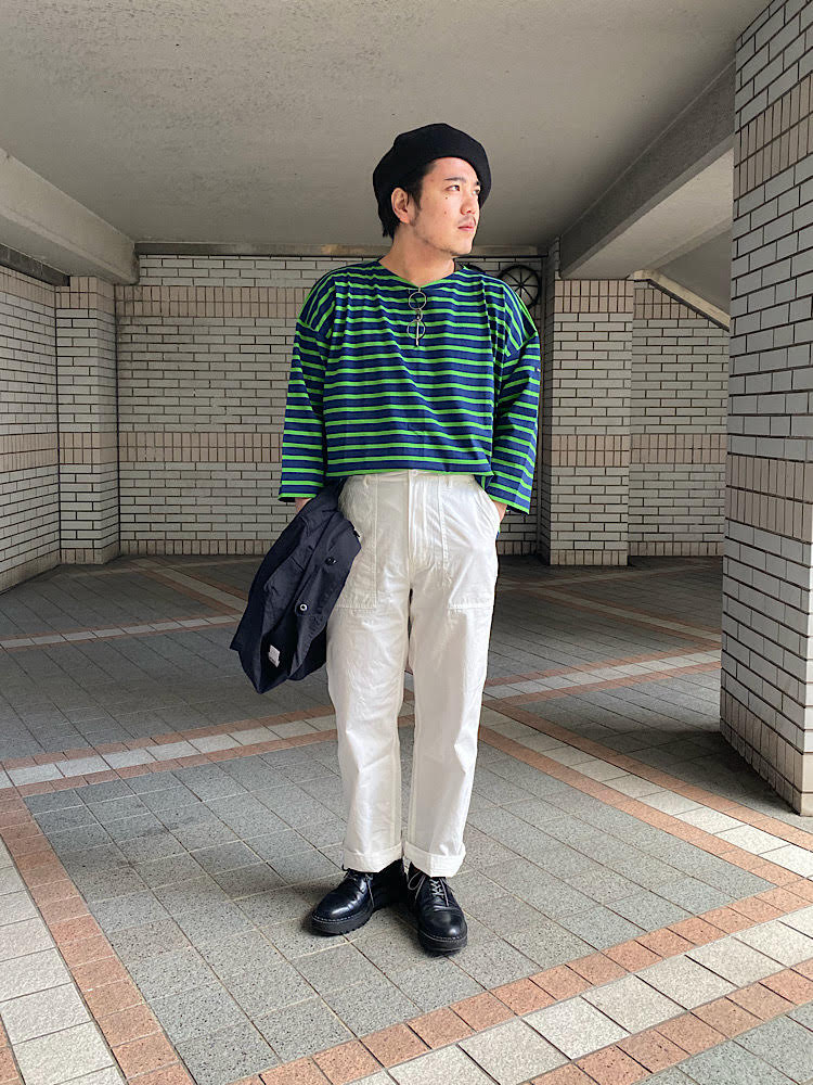 素材感/着心地:シャツの様な薄手のコットン素材で6月前後まで着用して頂けます。ミリタリー系もマリンルックで合わせればこなれた印象になります♪