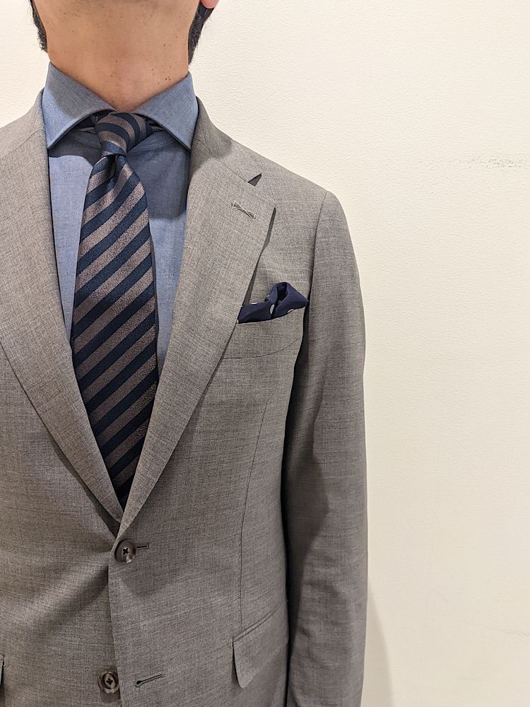 シャツ、タイ、チーフの色に統一感を出し、落ち着いたスタイルにまとめました。