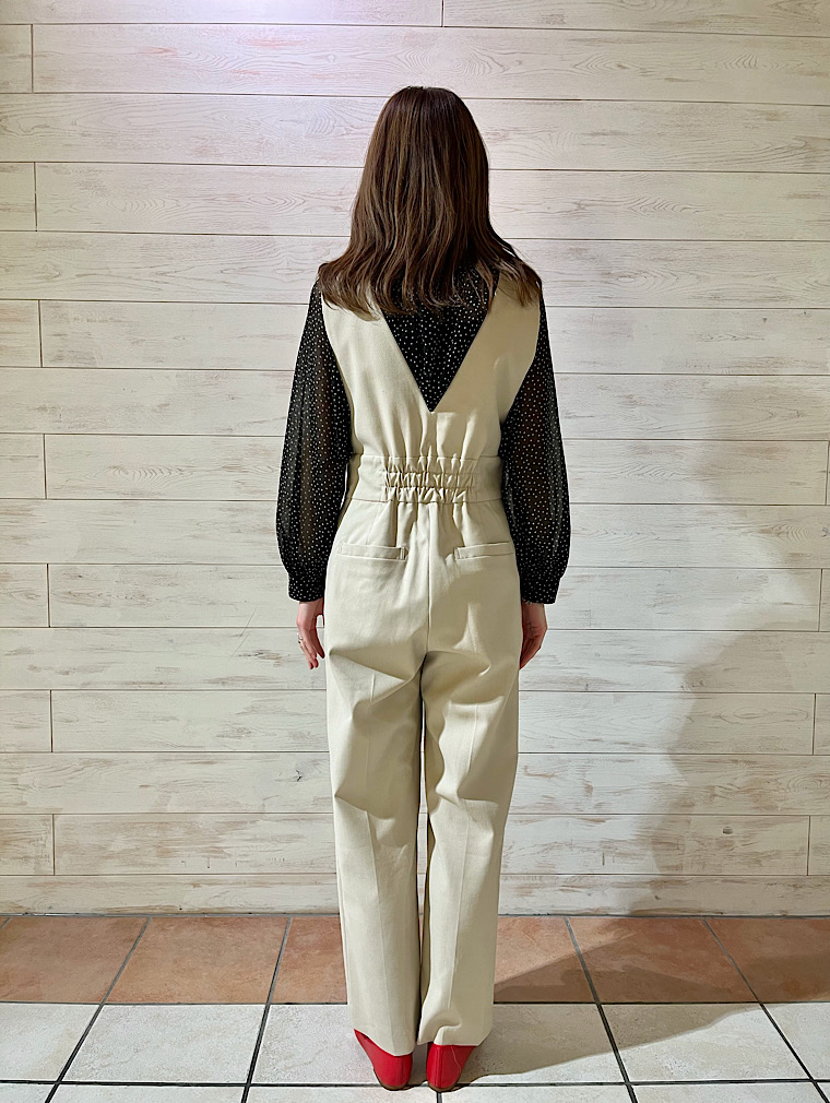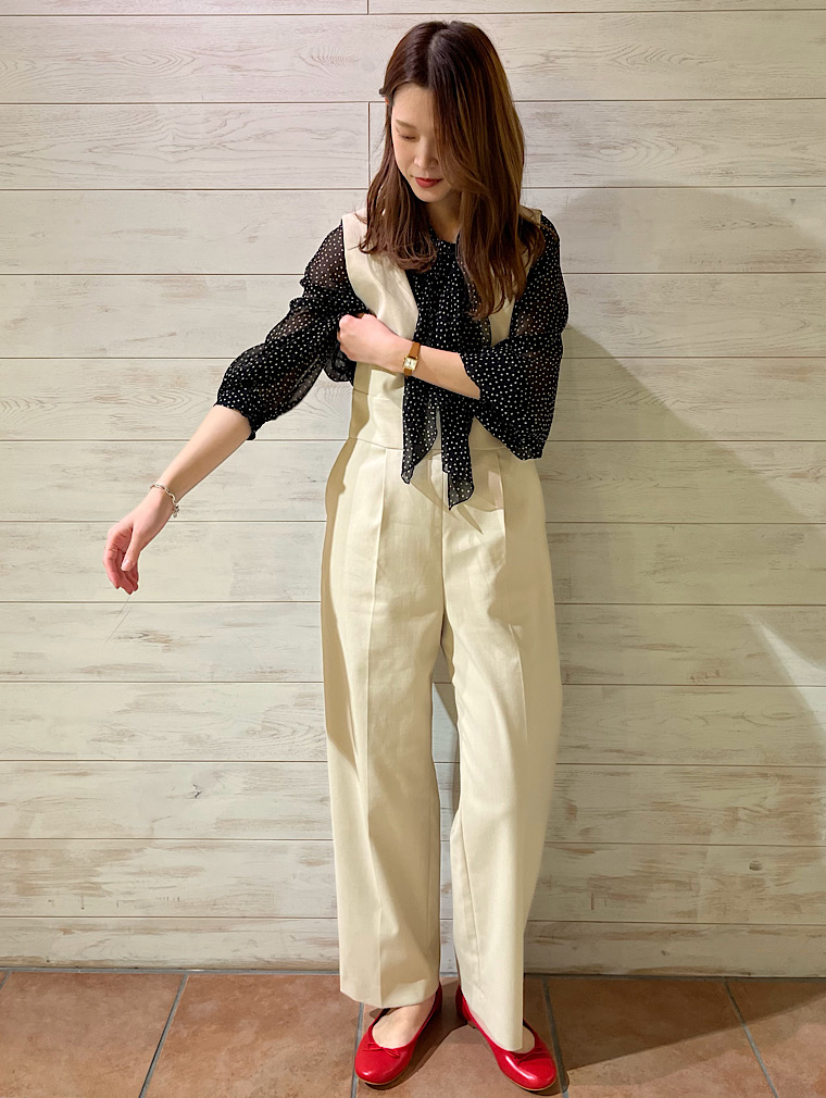 【素材感・着心地】麻ポリエステルで少しハリのある素材です。ウエスト位置が高く脚長効果抜群です!